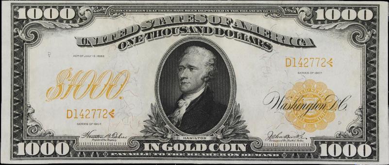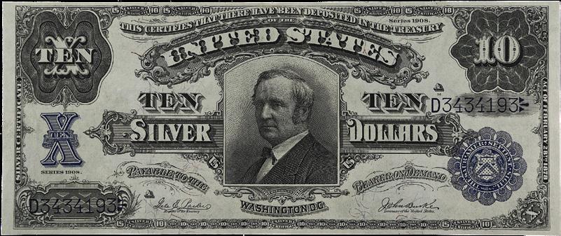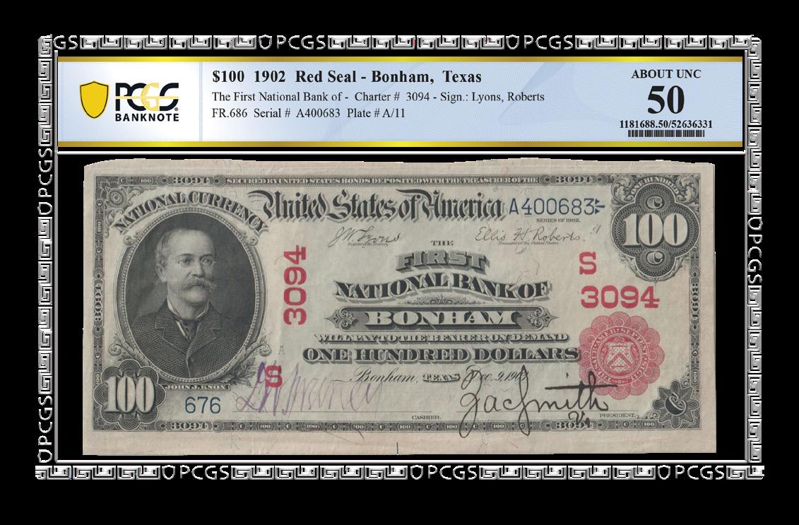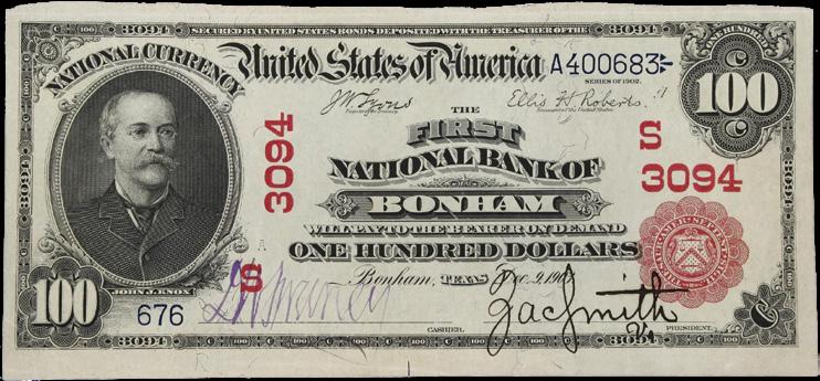 Higher-denominated Large-Size National Bank Notes always seem to command significant premiums when they make appearances at auction, especially those within higher, bettergrade categories. Issued at a time when $100 amounted to a very large sum of money for the average individual, not many of these were printed and placed into circulation due to the lack of necessity within commerce. This stunning series 1902 $100 Red Seal National from a small Bonham, Texas, bank features a portrait of John J. Knox, Comptroller of Currency from 1872 through 1884, and displays bold “100” denomination counters at lower-left and top-right corners flanking the institution’s formal title presented at center.