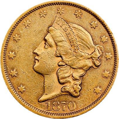 • TIED #23 – 1870-CC Liberty Head Double Eagle, PCGS AU50; $720,000, Stack’s Bowers Galleries