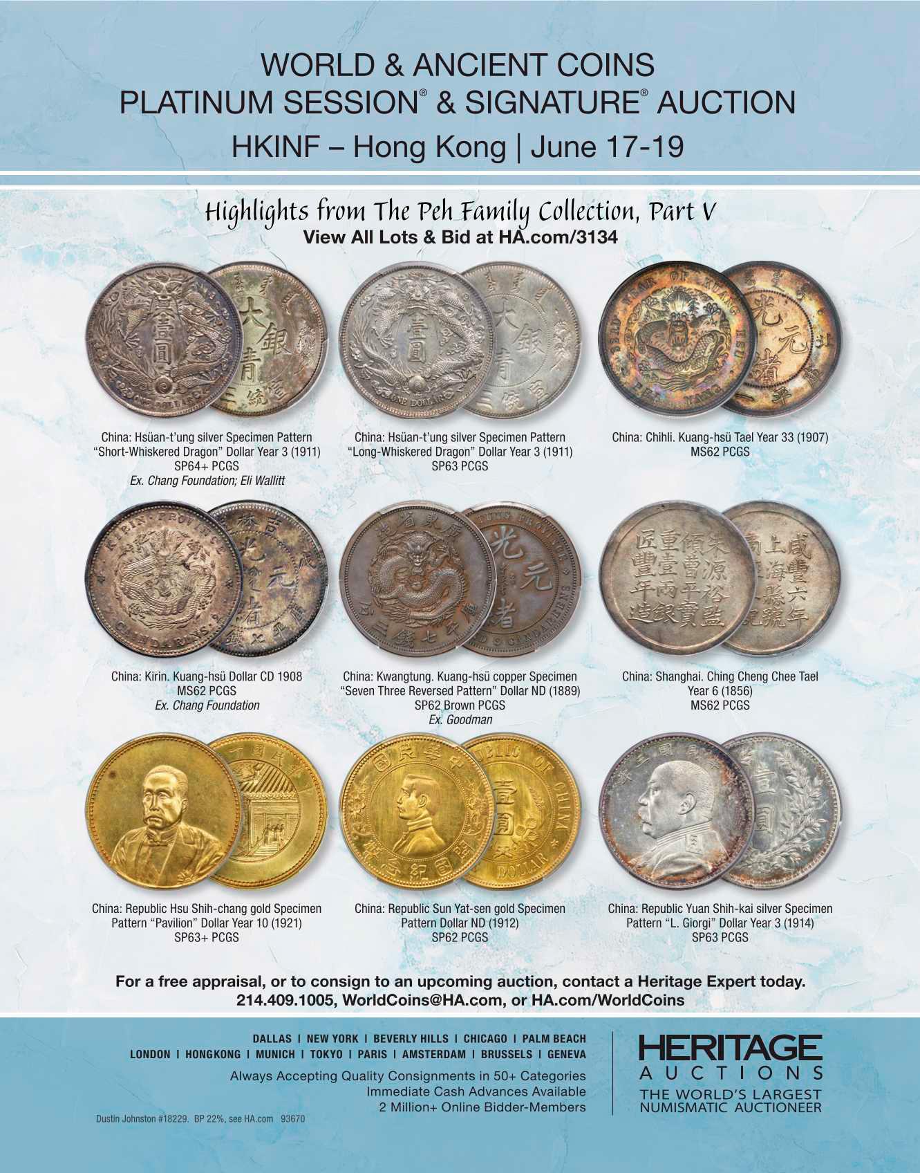 “Bar none, this is one of the most significant Chinese rarities,” said Heritage Auctions Numismatist Tita Peterson. “The most voracious collectors face defeat trying to acquire a Short-Whiskers dragon. The type simply does not surface publicly.” Auction records show choice examples of the LongWhiskers dragon type breaking the seven-figure threshold. “This, combined with the frothiness of the vintage Chinese market right now – no doubt inspired by the irrefutable quality and prestige of the Peh Family Collection – indicates that the sky is the limit for the Short-Whiskers.”