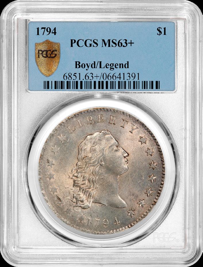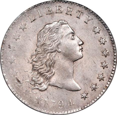 • #2 – 1794 Flowing Hair Dollar, BB-1, PCGS MS63+; $4,500,000, Stack’s Bowers Galleries