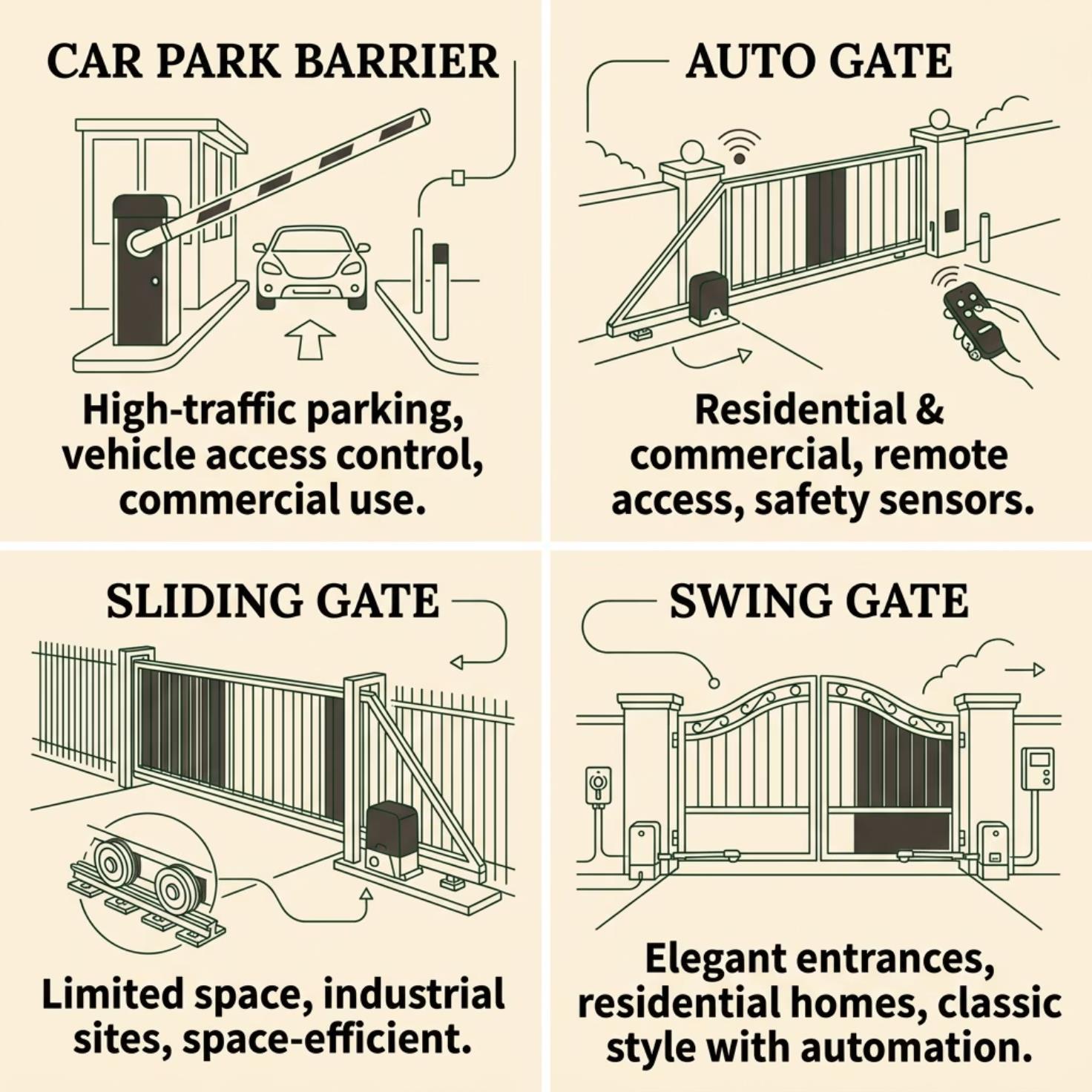 Eachgatetypeoffersdistinctadvantagesdependingonyourproperty'slayout,spaceconstraints,andsecurityrequirements.