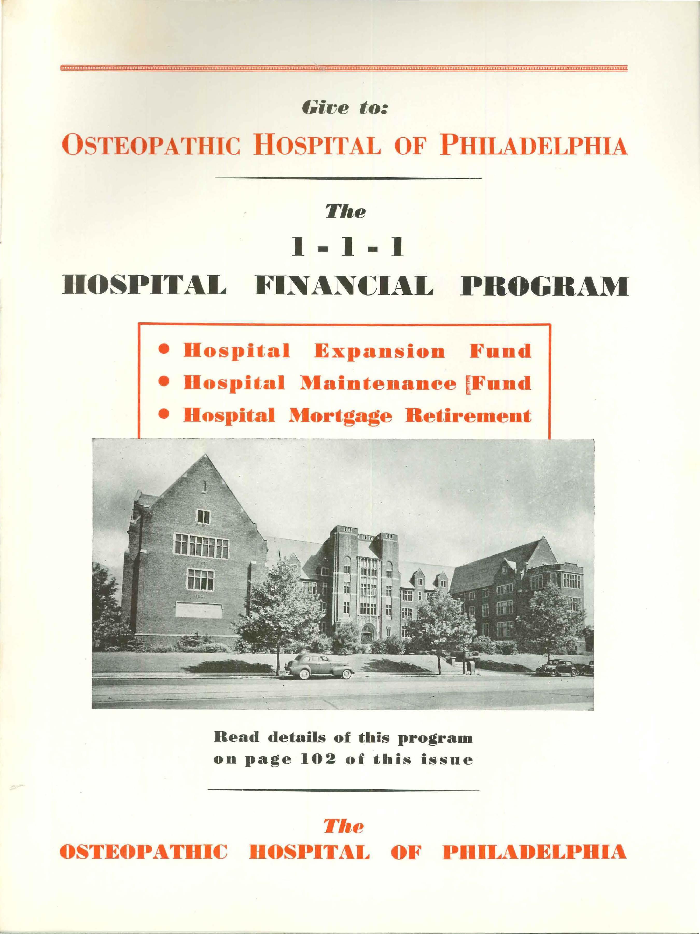 The Osteopathic Hospital of Philadelphia is the great teaching arm of the college, it has served us long and well. No patient is admitted without a student assigned. Thus all patients serve in some measure as teaching cases. Fortunately, the college does not have to bear too heavy a financial burden, because most of these patients pay most of the cost. The expansion of the hospital is an obvious need for the further development of our teaching program and our service to the community.