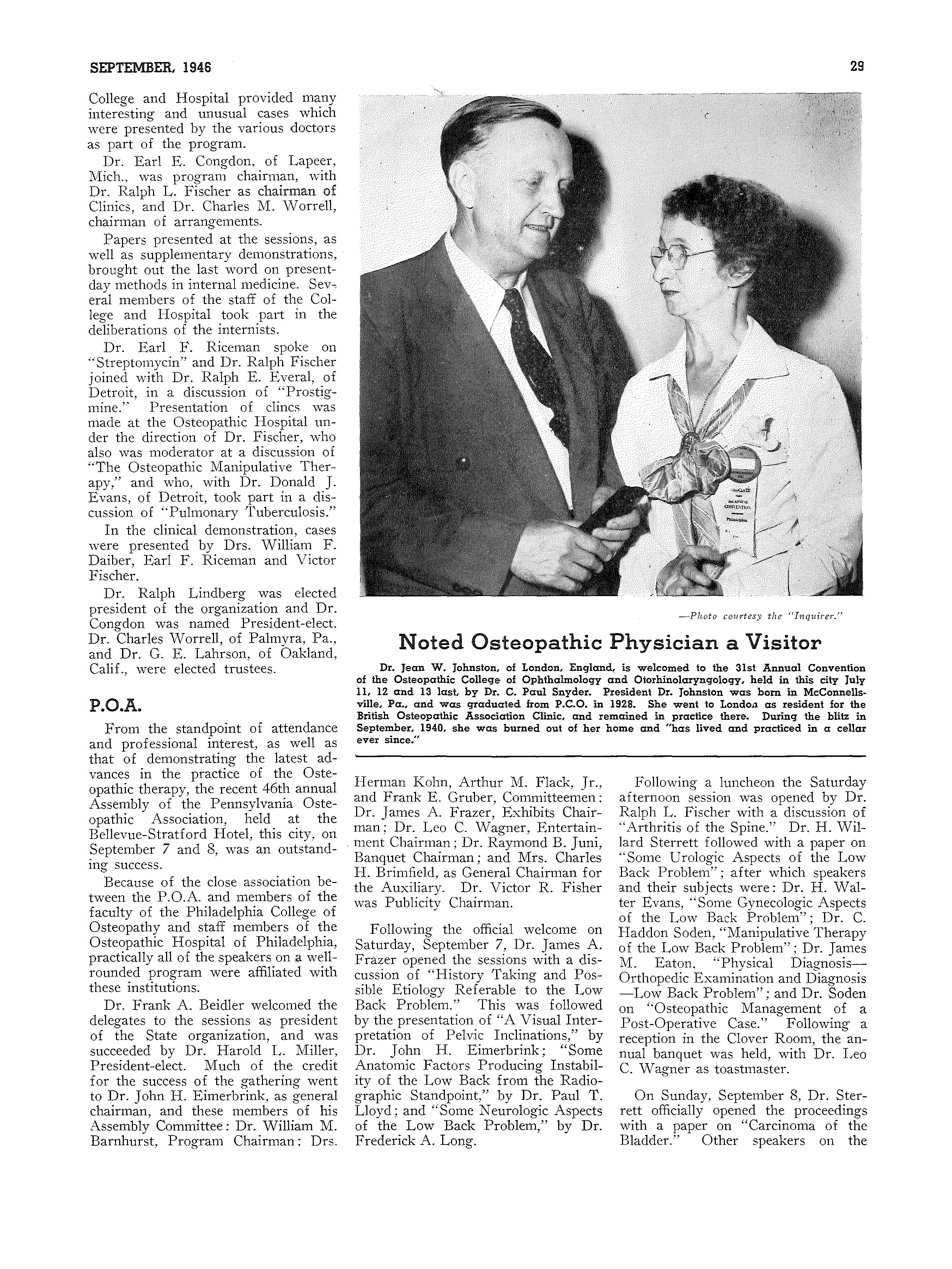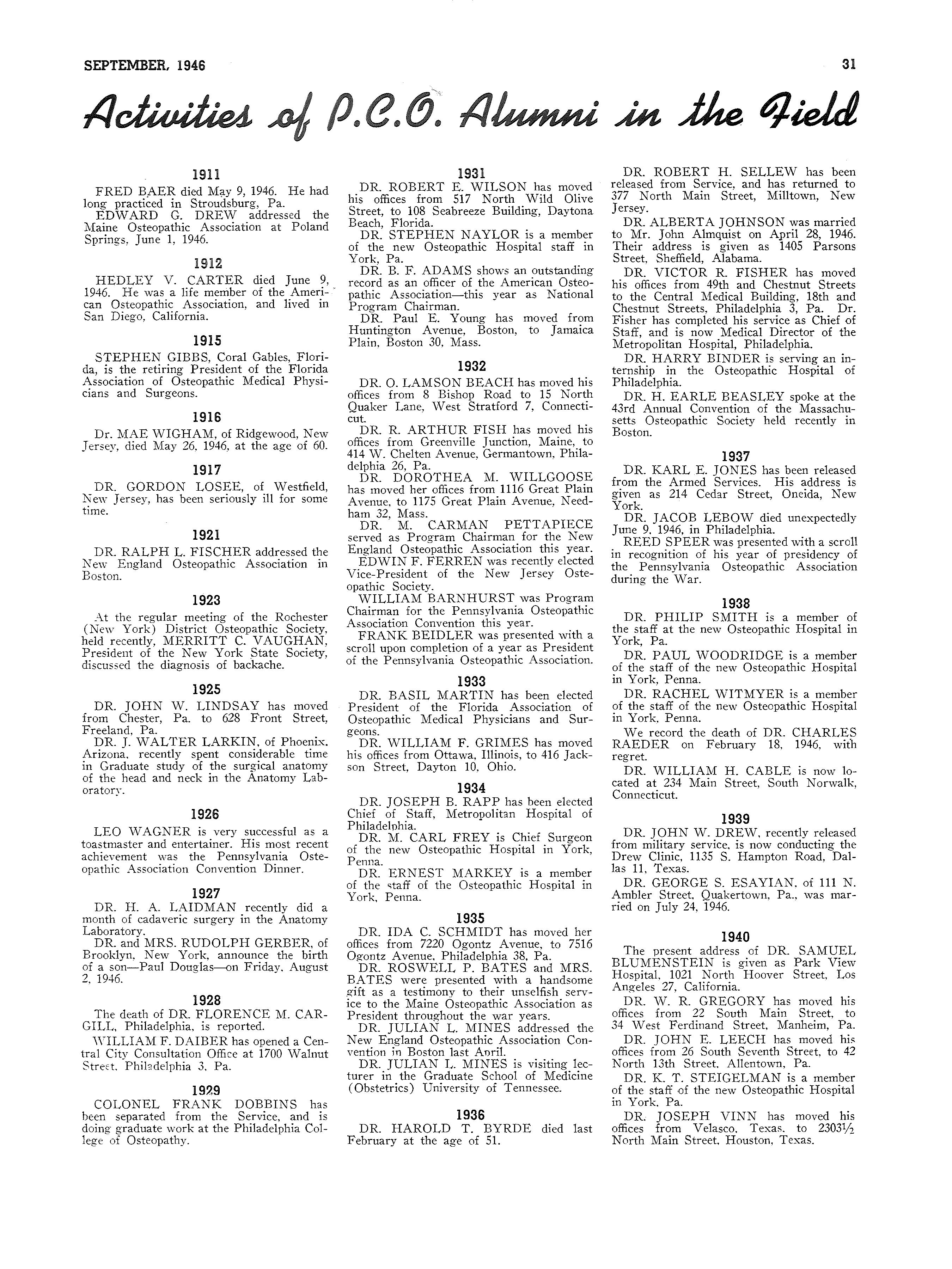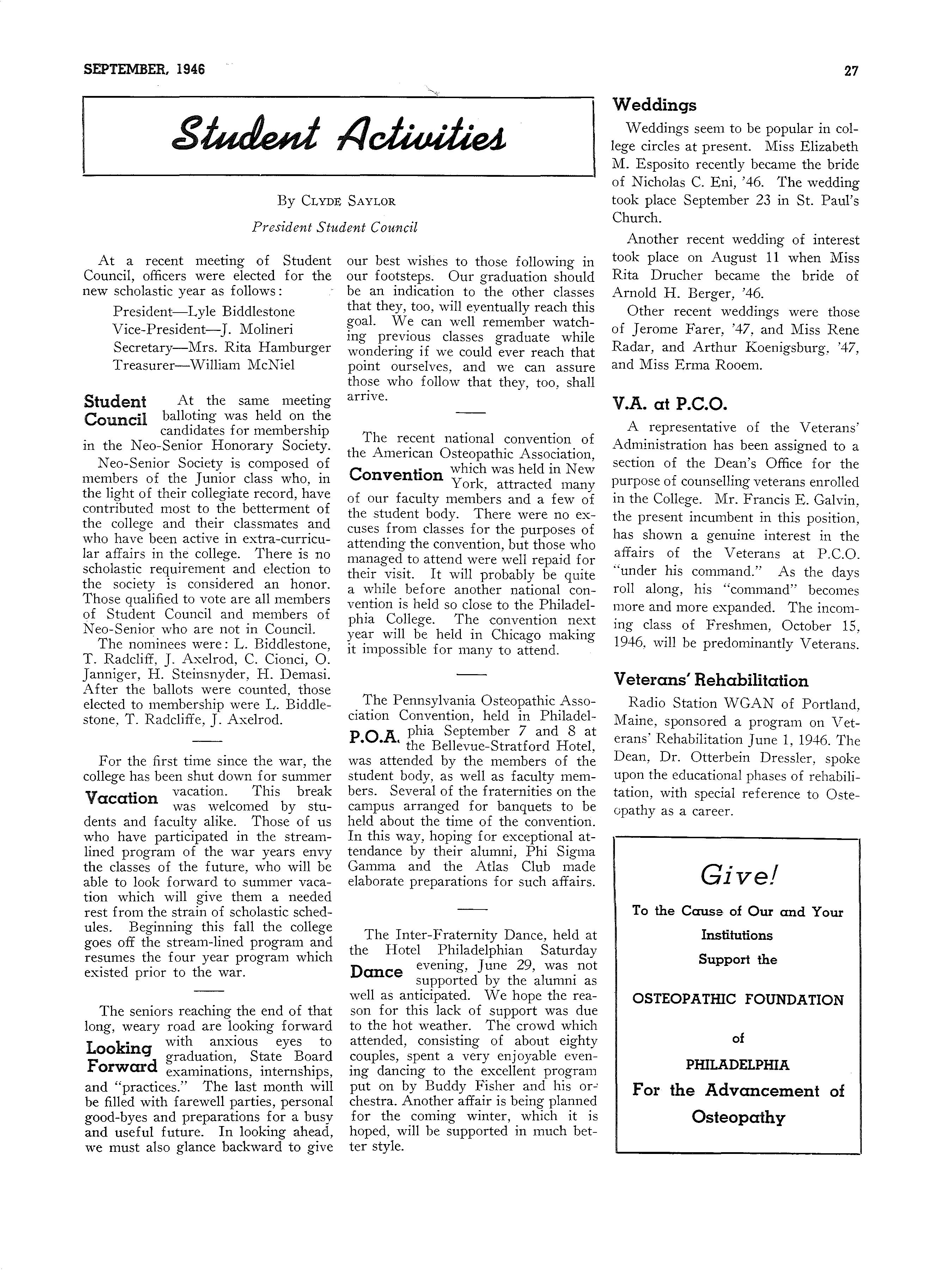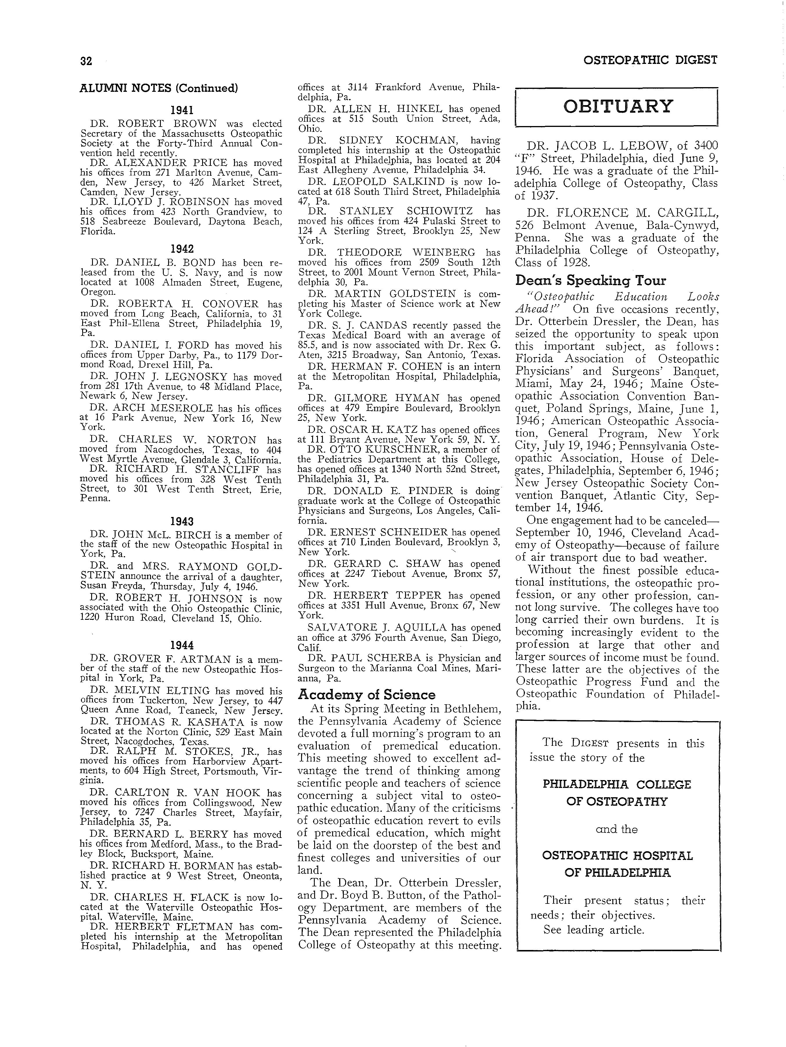 "Osteopathic Education Looks Ahead!n On five occasions recently, Dr. Otterbein Dressler, the Dean, has seized the opportunity to speak upon this important subject, as follows: Florida Association of Osteopathic Physicians' and Surgeons' Banquet, Miami, May 24, 1946; Maine Osteopathic Association Convention Banquet, Poland Springs, Maine, June 1, 1946; American Osteopathic Association, General Program, New York City, July 19, 1946; Pennsylvania Osteopathic Association, House of Delegates, Philadelphia, September 6, 1946; New Jersey Osteopathic Society Convention Banquet, Atlantic City, September 14, 1946.