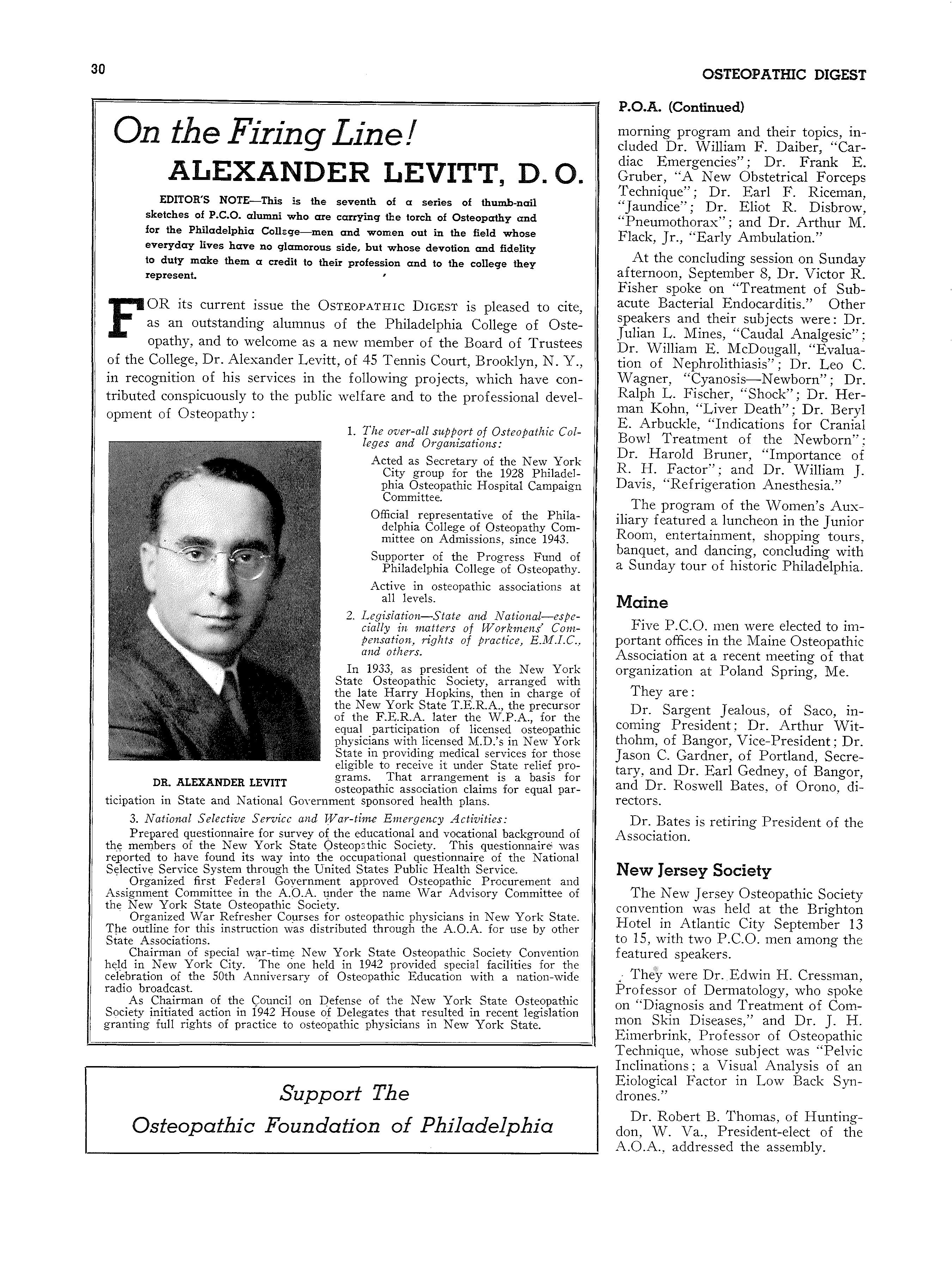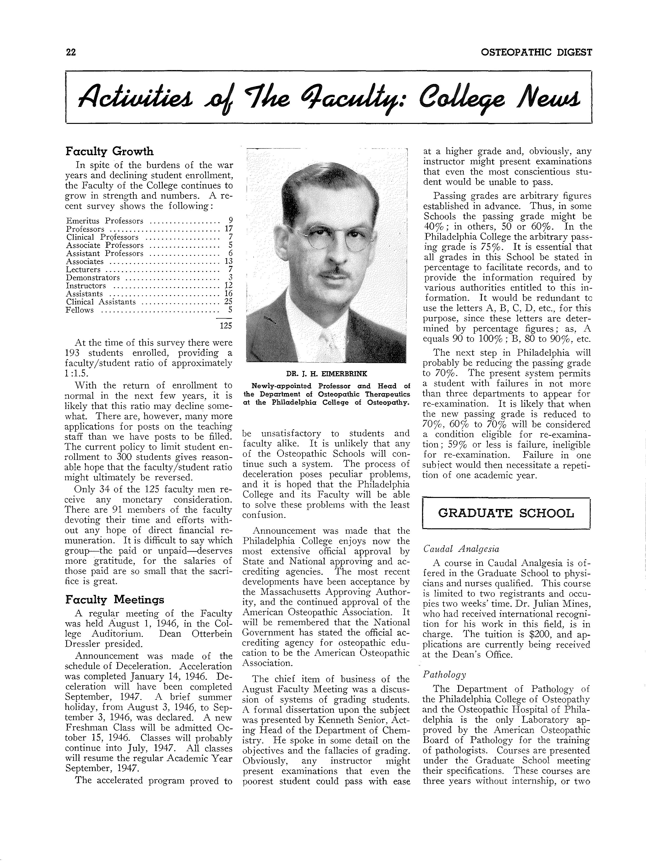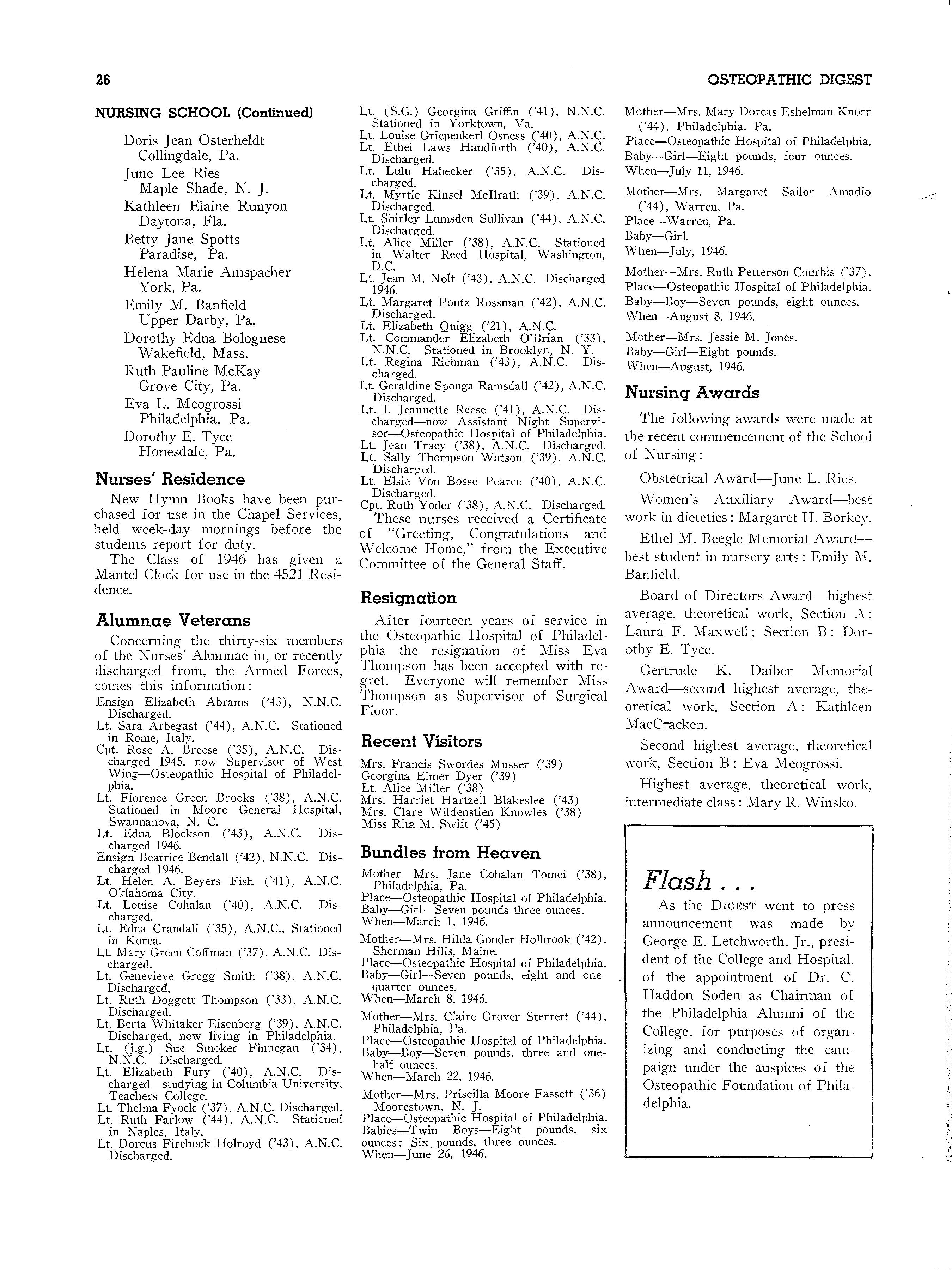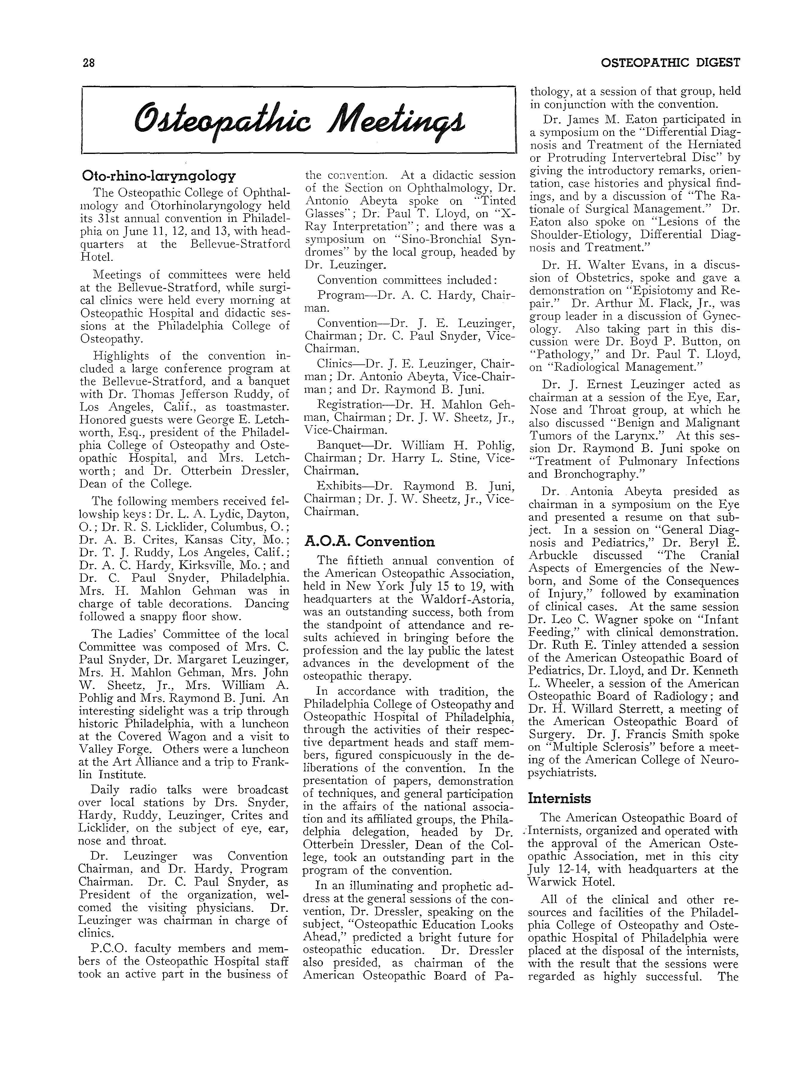 "Osteopathic Education Looks Ahead!n On five occasions recently, Dr. Otterbein Dressler, the Dean, has seized the opportunity to speak upon this important subject, as follows: Florida Association of Osteopathic Physicians' and Surgeons' Banquet, Miami, May 24, 1946; Maine Osteopathic Association Convention Banquet, Poland Springs, Maine, June 1, 1946; American Osteopathic Association, General Program, New York City, July 19, 1946; Pennsylvania Osteopathic Association, House of Delegates, Philadelphia, September 6, 1946; New Jersey Osteopathic Society Convention Banquet, Atlantic City, September 14, 1946.