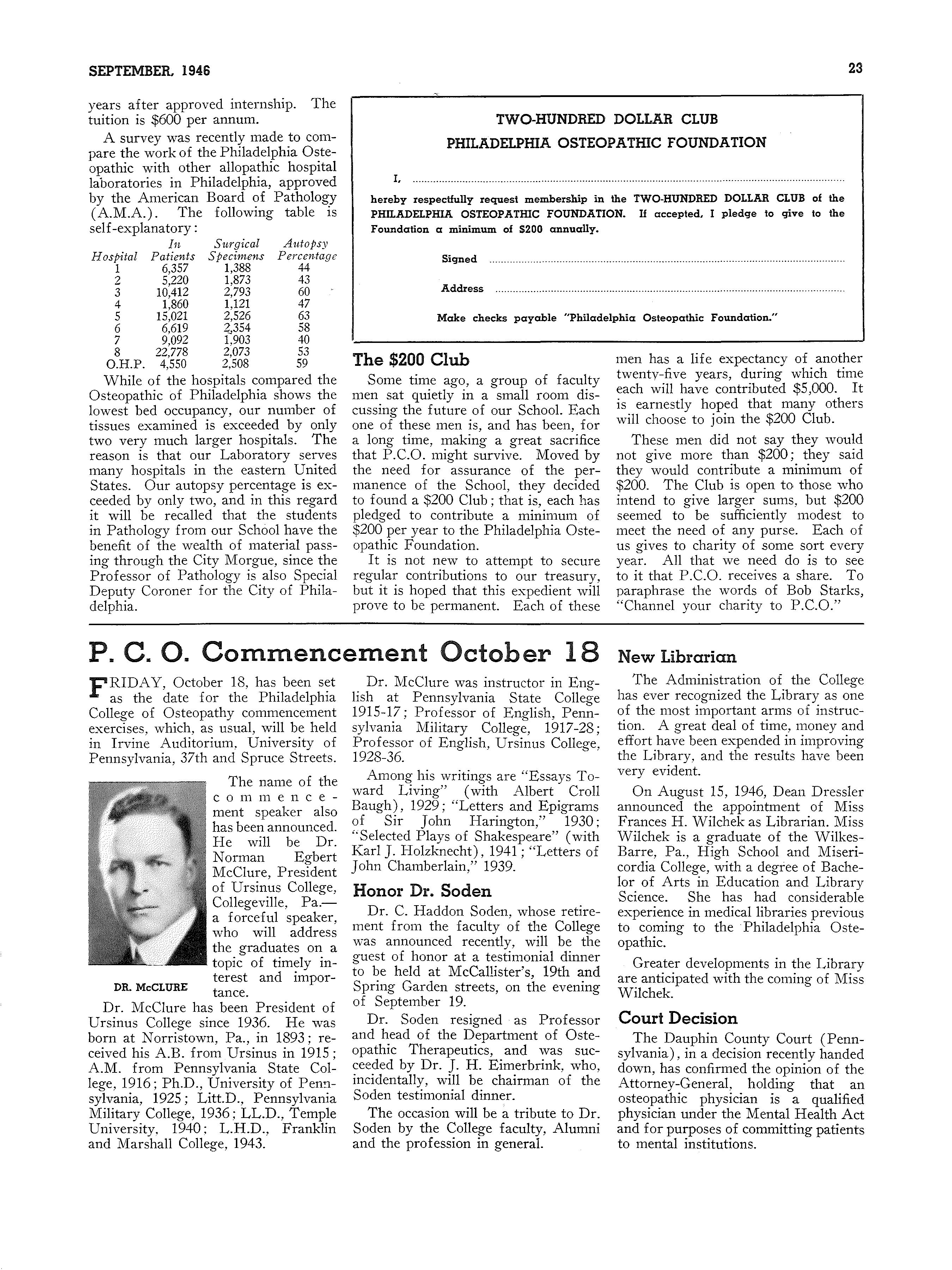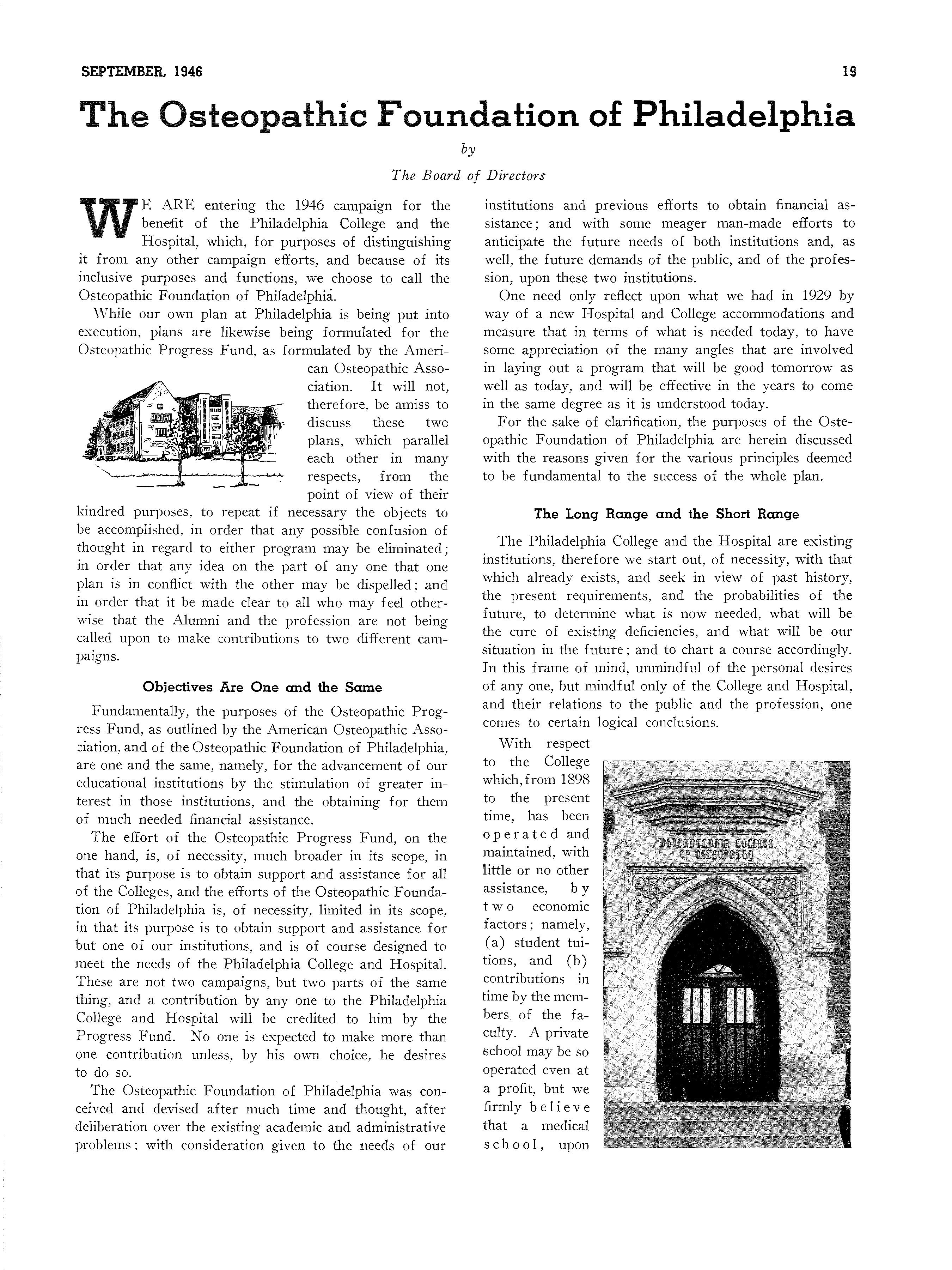 WE ARE entering the 1946 campaign for the benefit of the Philadelphia College and the Hospital, which, for purposes of distinguishing it from any other campaign efforts, and because of its inclusive purposes and functions, we choose to call the Osteopathic Foundation of Philadelphia.