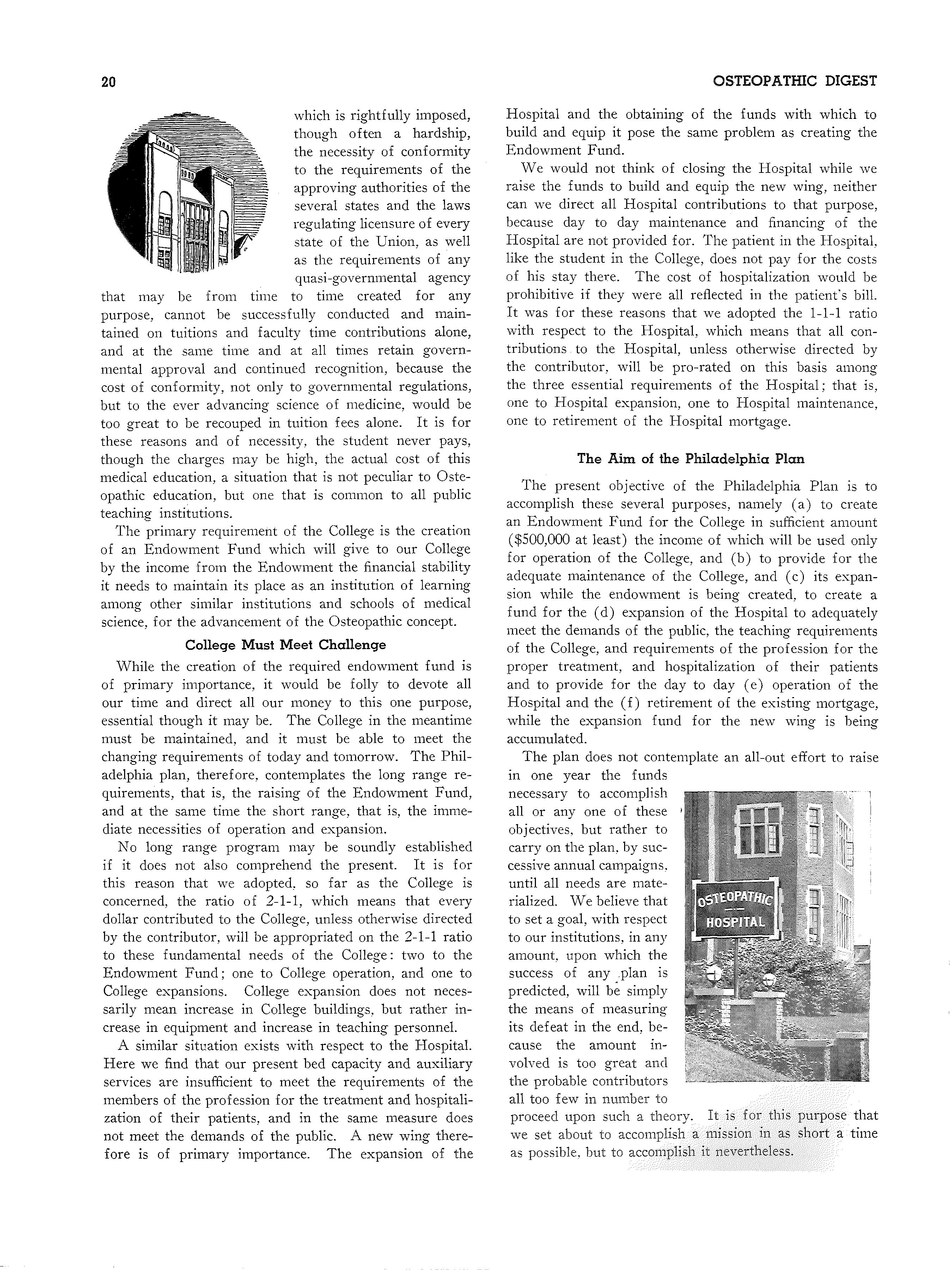 The present objective of the Philadelphia Plan is to accomplish these several purposes, namely (a) to create an Endowment Fund for the College in sufficient amount ($500,000 at least) the income of which will be used only for operation of the College, and (b) to provide for the adequate maintenance of the College, and (c) its expansion while the endowment is being created, to create a fund for the (d) expansion of the Hospital to adequately meet the demands of the public, the teaching requirements of the College, and requirements of the profession for the proper treatment, and hospitalization of their patients and to provide for the day to day (e) operation of the Hospital and the (f) retirement of the existing mortgage, while the expansion fund for the new wing is being accumulated.