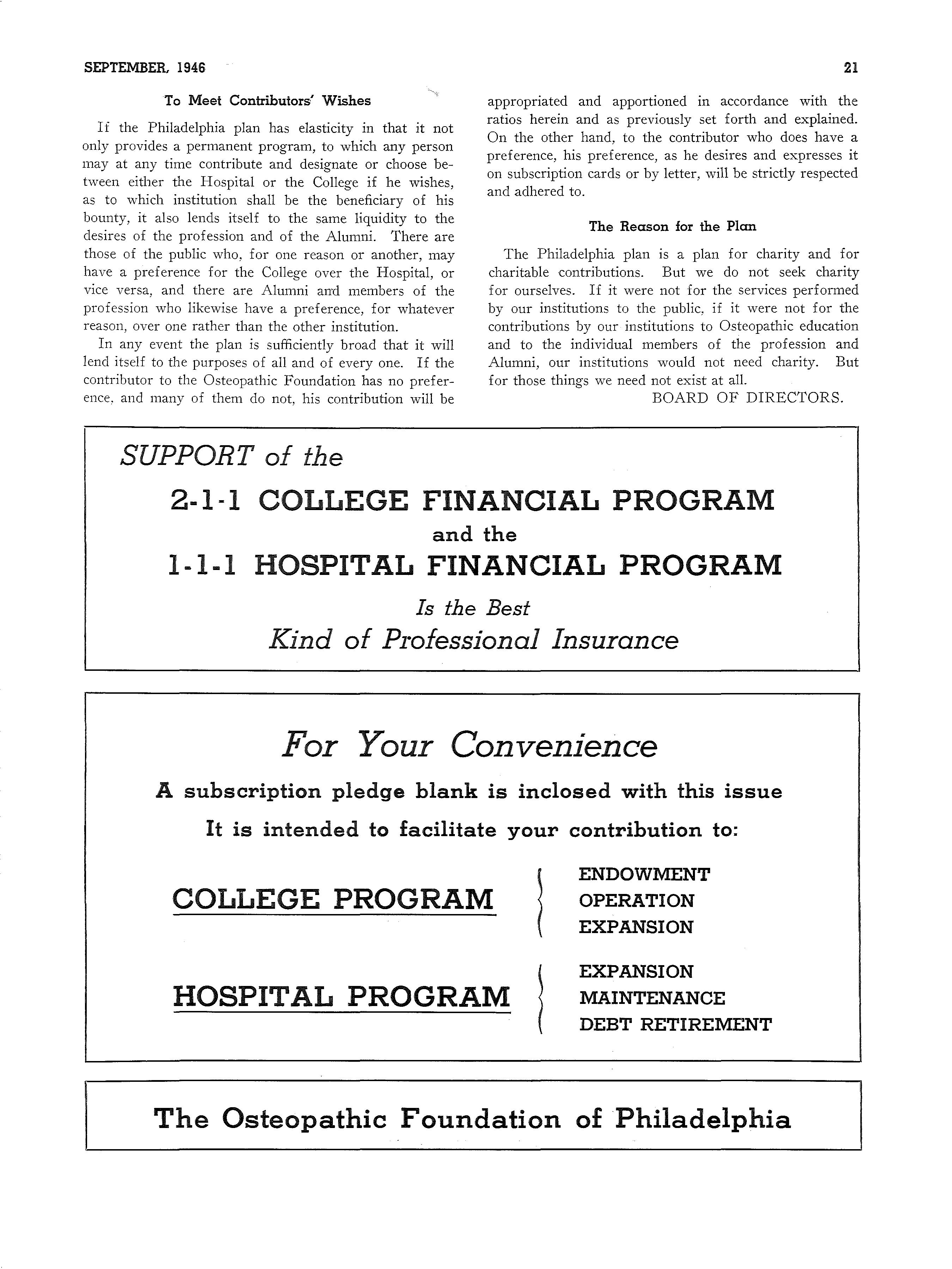 2-1-1 COLLEGE FINANCIAL PROGRAM and the 1-1-1 HOSPITAL FINANCIAL PROGRAM Is the Best Kind of P1·ofessional Insurance For Your Convenience A subscription pledge blank is inclosed with this issue It is intended to facilitate your contribution to: l ENDOWMENT OPERATION EXPANSION COLLEGE PROGRAM l EXPANSION MAINTENANCE DEBT RETIREMENT HOSPITAL PROGRAM The Osteopathic Foundation of Philadelphia