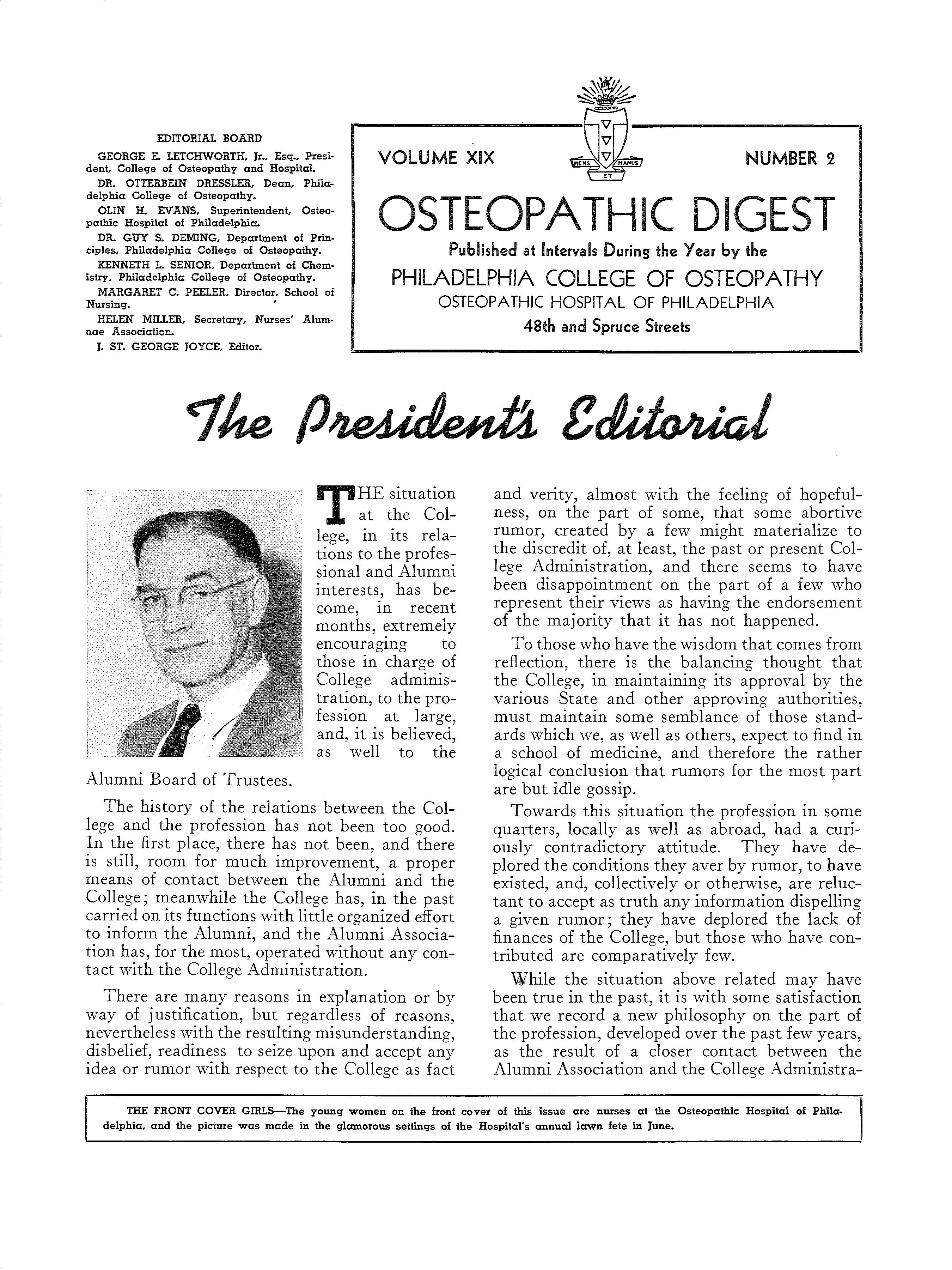 THE FRONT COVER GIRLS-The young women on the front cover of this issue are nurses at the Osteopathic Hospital of Philadelphia. and the picture was made in the glamorous settings of the Hospital's annual lawn fete in June.