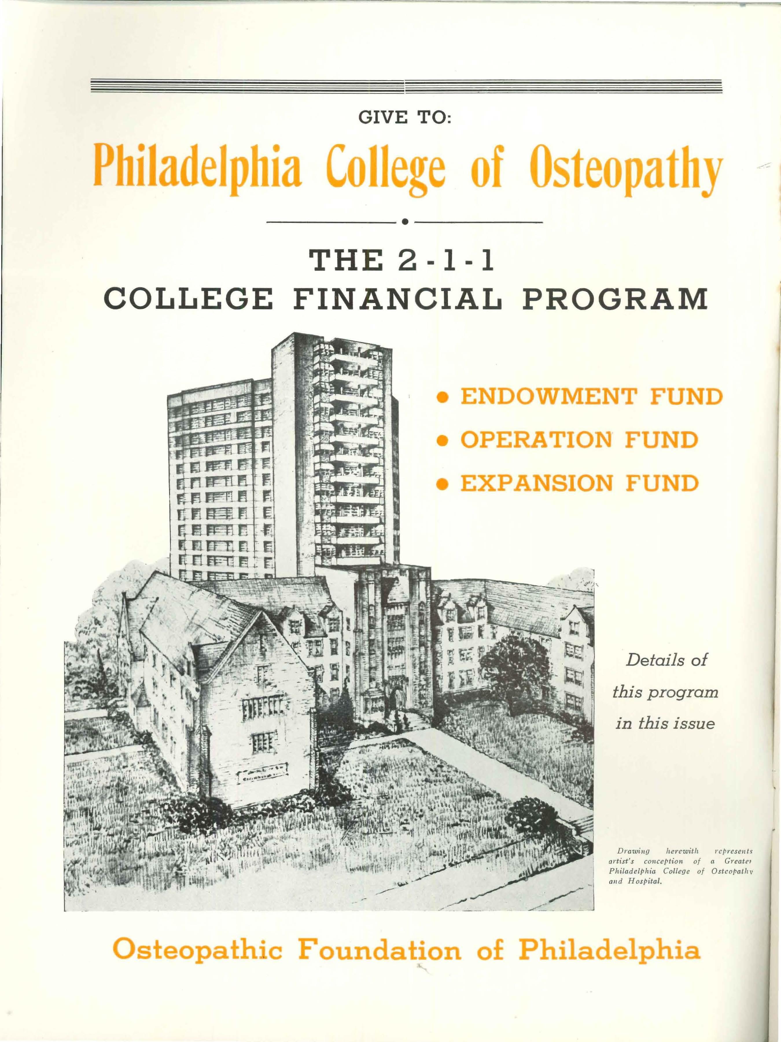 GIVE TO : P tladelphia College of Osteopathy ----·---THE 2 - 1-1 COLLEGE FINANCIAL PROGRAM • ENDOWMENT FUND • OPERATIO FUND • EXPANSION FUND Details of this program in this issue Dra wiug herewith rep resell ts artist ' s couceptioH of n. Greate1 PhiladelPhia Co ll ege of Ostcof>allt\• and HosPital. Osteopath:c Foundation of Philadelphi