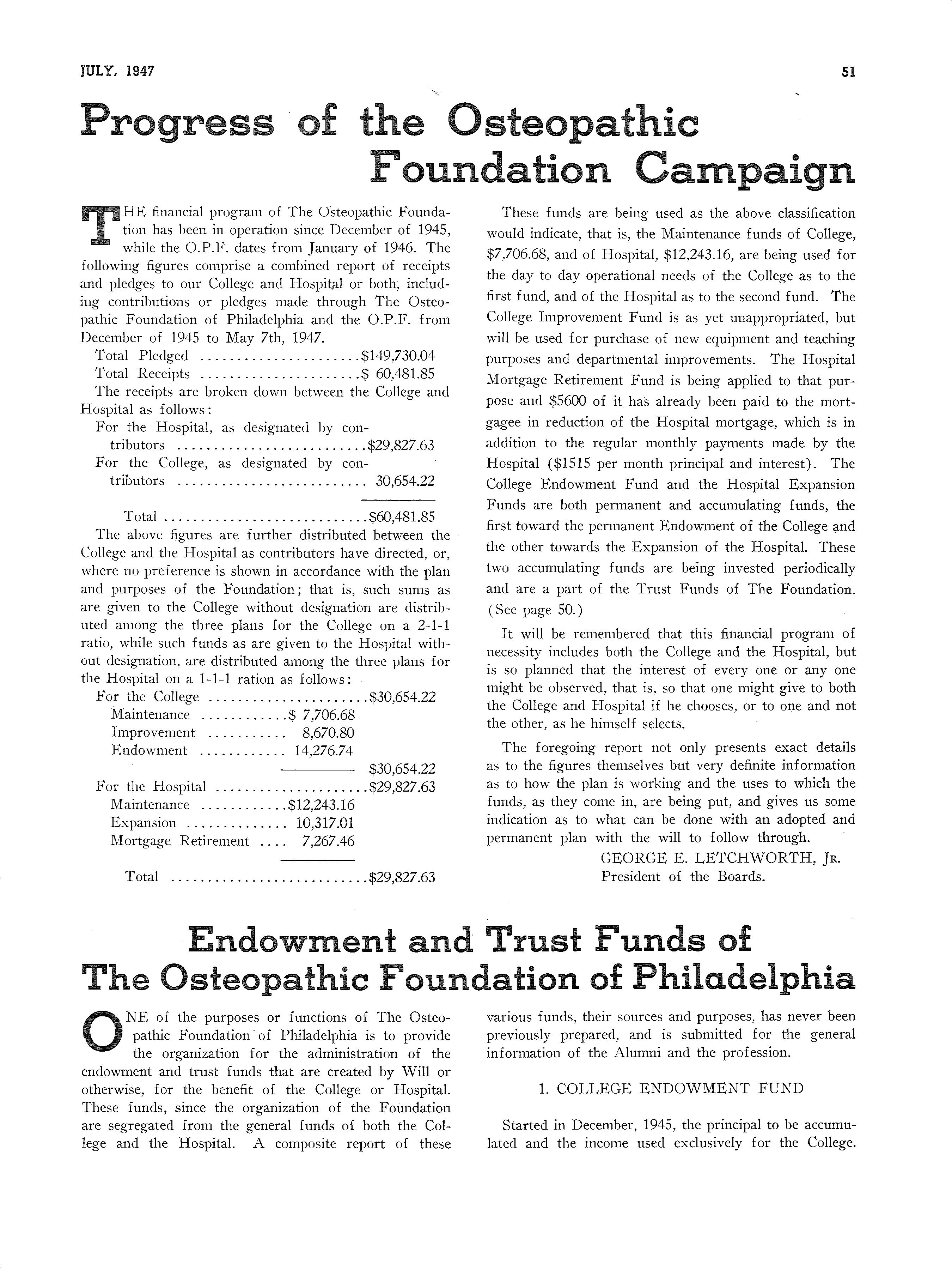 GEORGE E. LETCHWORTH, JR. President of the Boards.NE of the purposes or functions of The Osteopathic Foundation of Philadelphia is to provide the organization for the administration of the endowment and trust funds that are created by Will or otherwise, for the benefit of the College or HospitaL These funds, since the organization of the Foundation are segregated from the general funds of both the College and the HospitaL A composite report of these