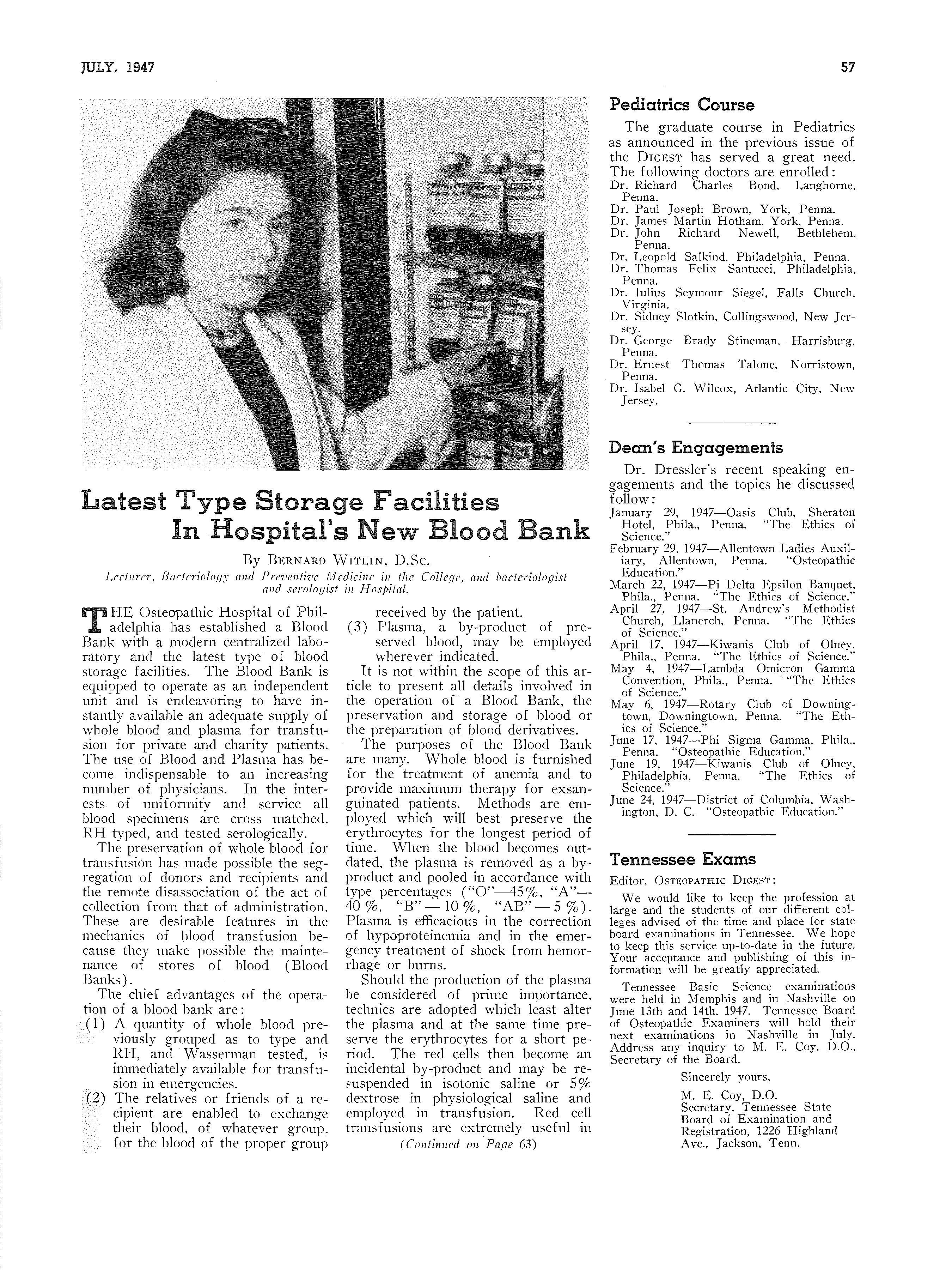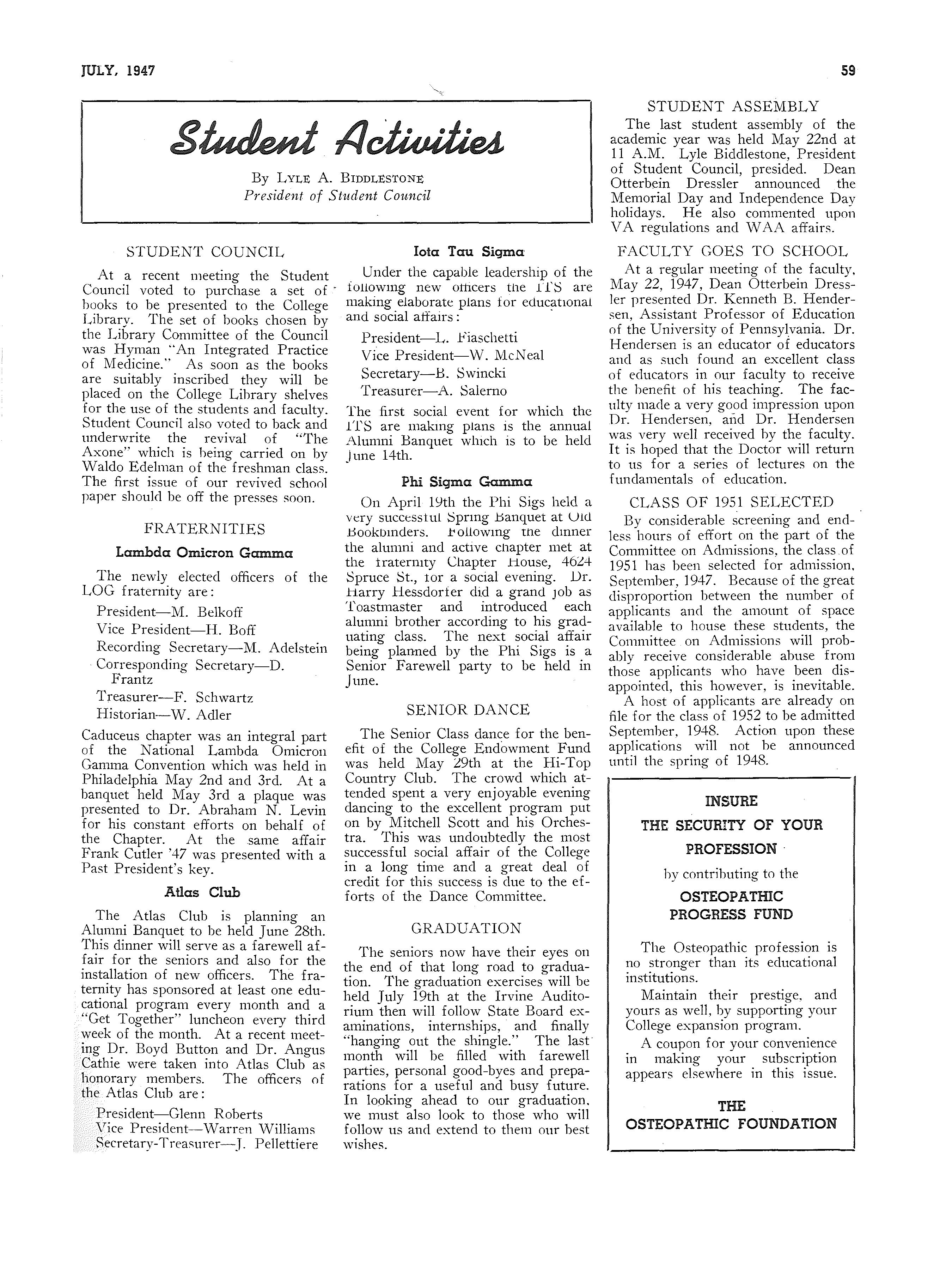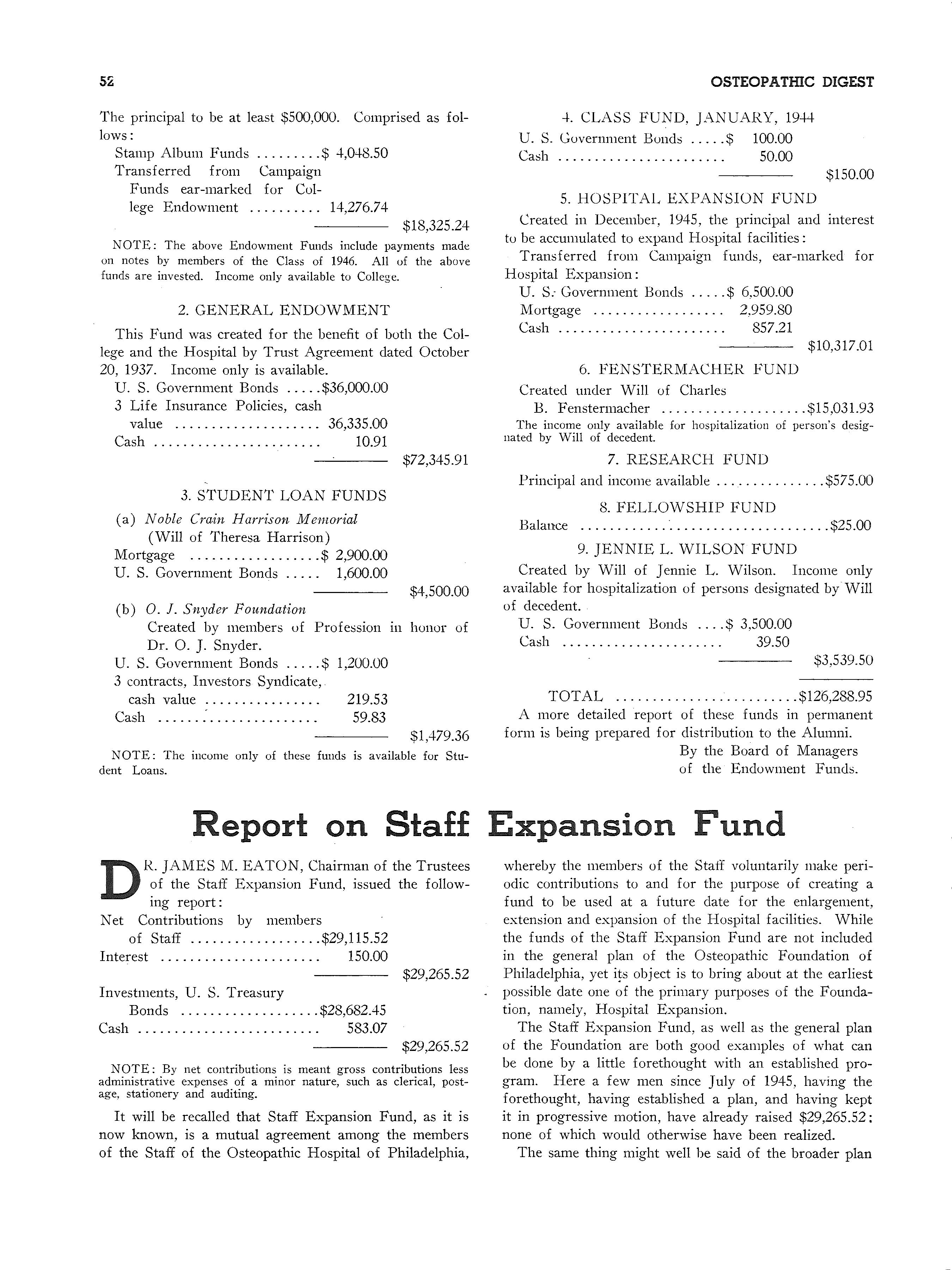On the other hand, the administrative officers of the Philadelphia College, with their knowledge of the local situation, concluded for very good reasons, that there should be formulated a permanent and definite plan of progress, both educational and financial, with respect to the Philadelphia College and its Hospital. Accordingly, The Osteopathic Foundation came into being, for the dual purpose of raising funds for the Philadelphia College and to provide a definite educational program for the all around improvement of the Philadelphia College. The Foundation, therefore, goes further than the raising of funds, for it contains a systematic plan for the use of such funds as it receives 1 whether directly or through the O.P.F.
