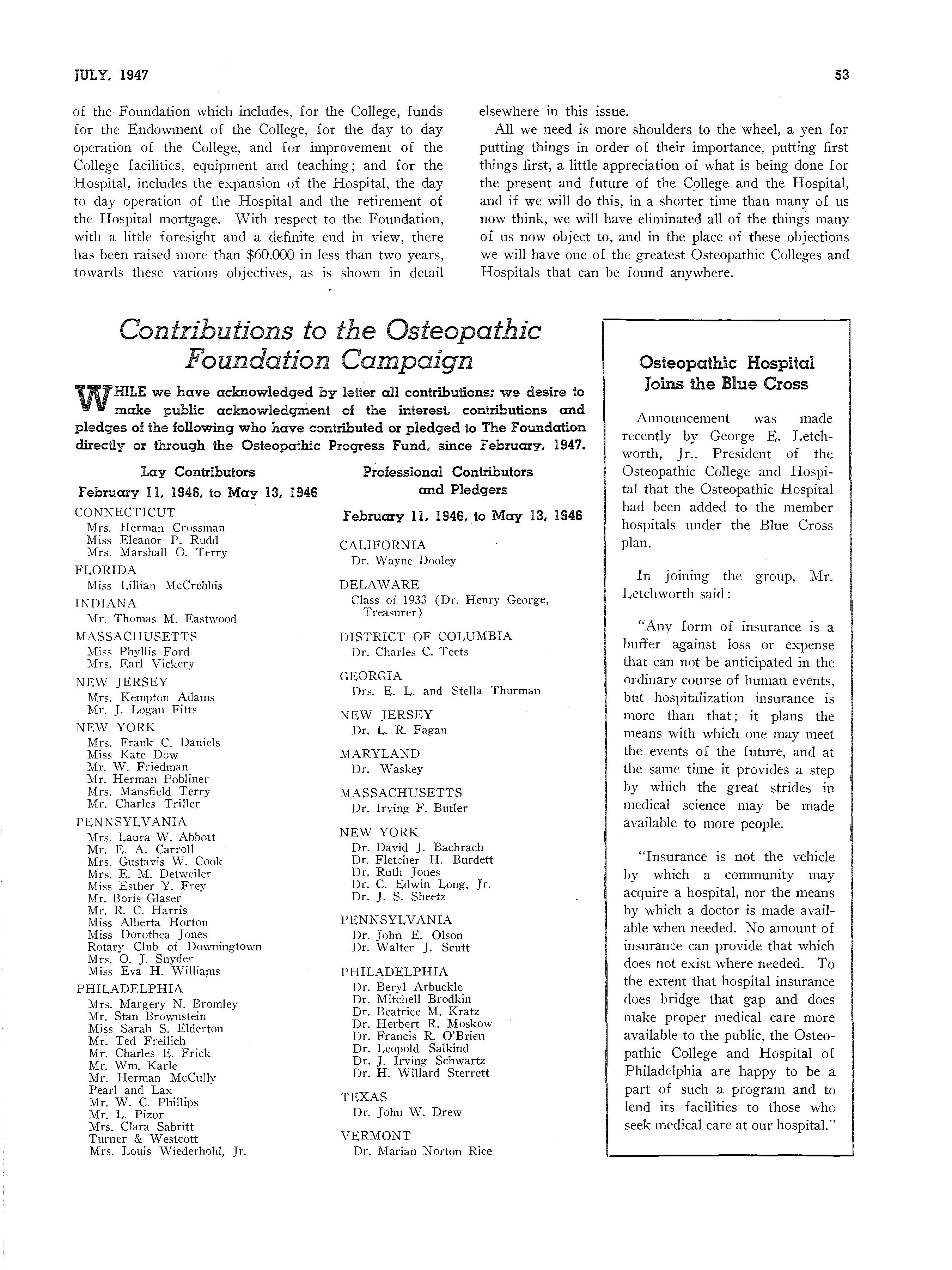 NOTE: The program for the Philadelphia College and Hospital is a part of the Osteopathic Progress Fund. Make your pledge or contribution to the Philadelphia College through the Osteopathic Progress Fund. 139 N. Clark Street, Chicago 2, lllinois, or through The Osteopathic Foundation of Philadelphia, 48th and Spruce Streets, Philadelphia 39, Pa as may be desired.