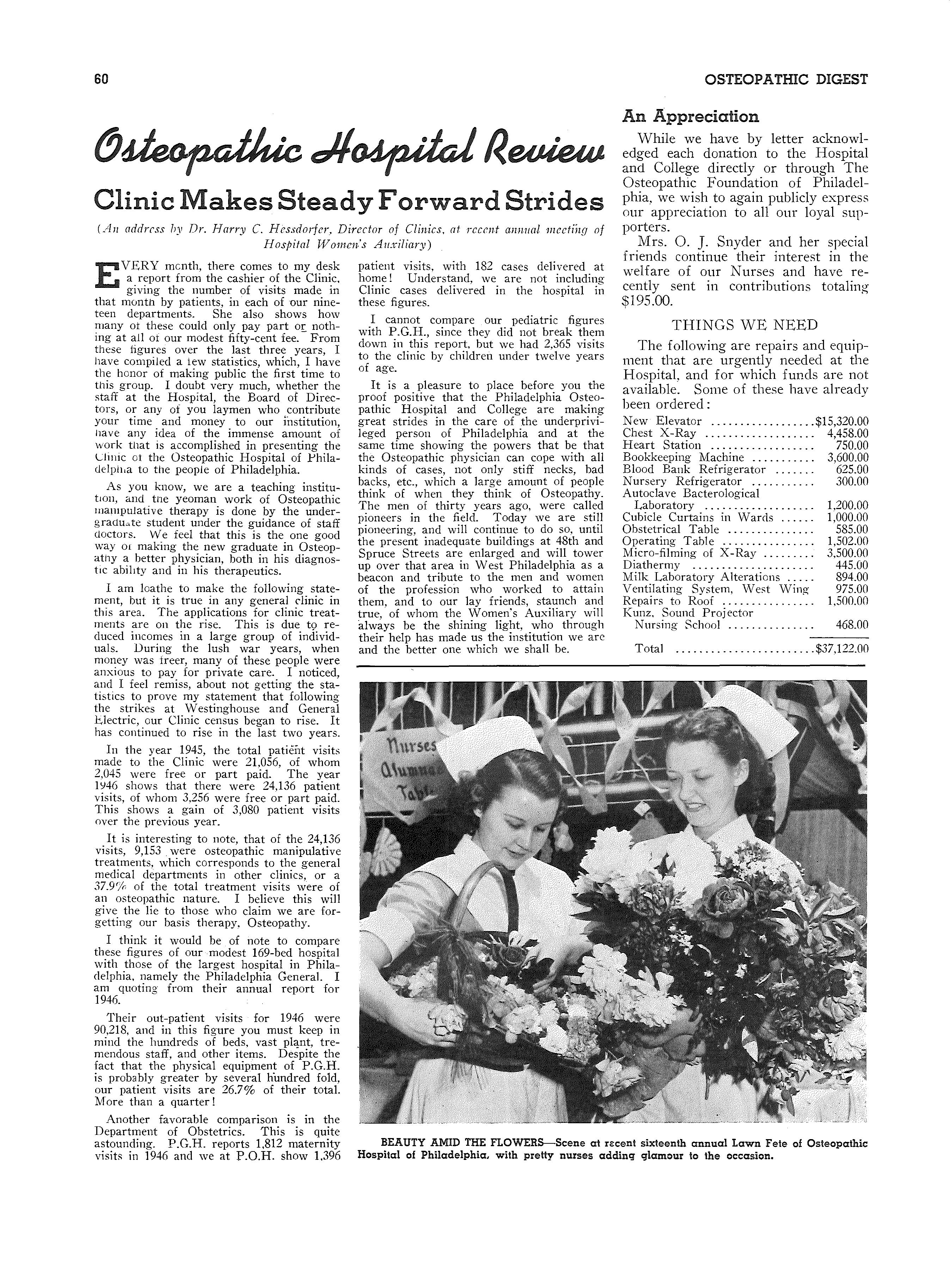 All we need is more shoulders to the wheel, a yen for putting things in order of their importance, putting first things first, a little appreciation of what is being done for the present and future of the College and the Hospital, and if we will do this, in a shorter time than many of us now think, we will have eliminated all of the things many of us now object to, and in the place of these objections we will have one of the greatest Osteopathic Colleges and Hospitals that can be found anywhere.