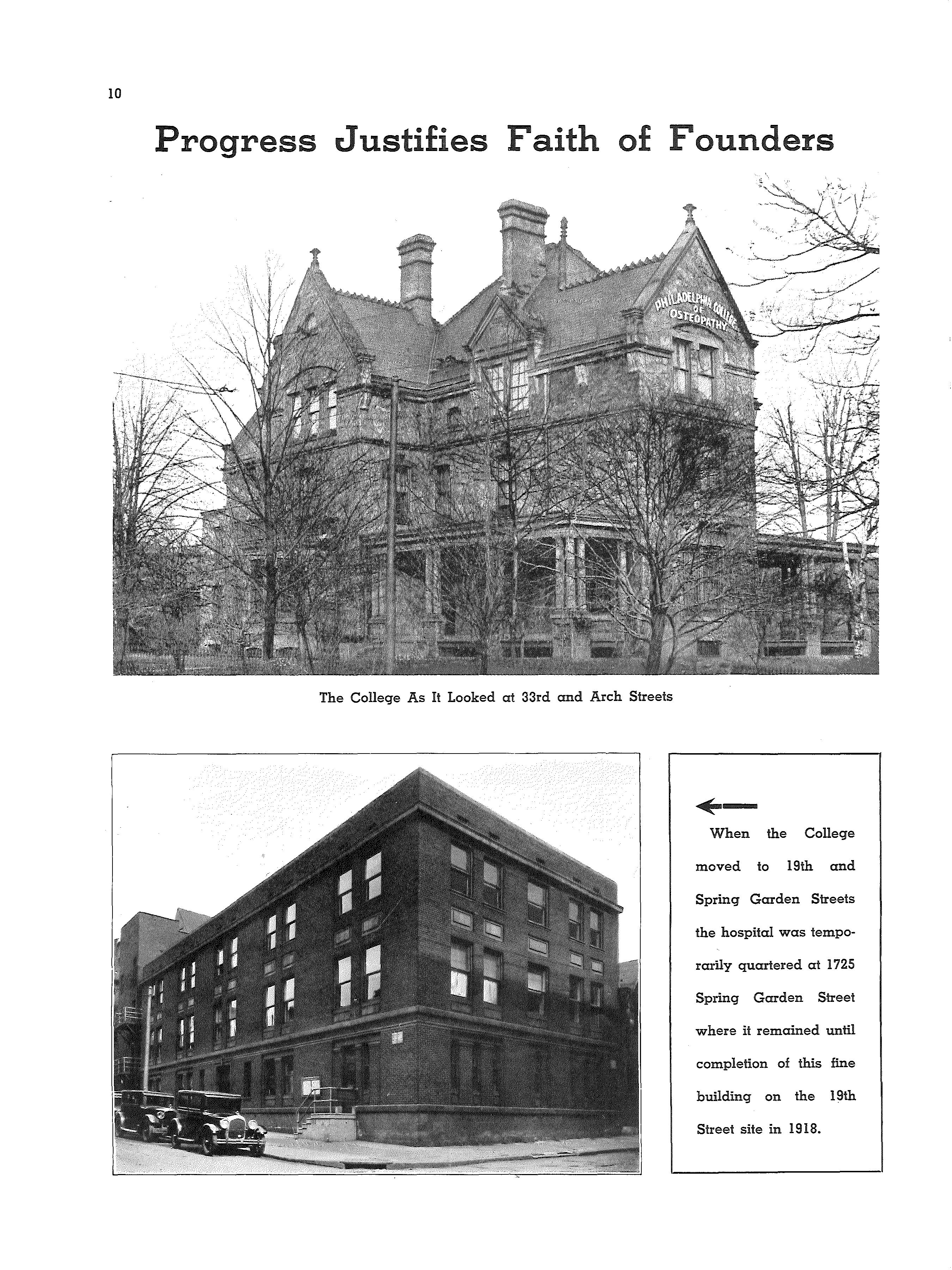 The Philadelphia College of Osteopathy and its teaching adjunct 1 the Osteopathic Hospital of Philadelphia, stand as a powerful bulwark against the inroads of disease. Together they form a citadel of strength in the advancement of the Osteopathic Therapy.