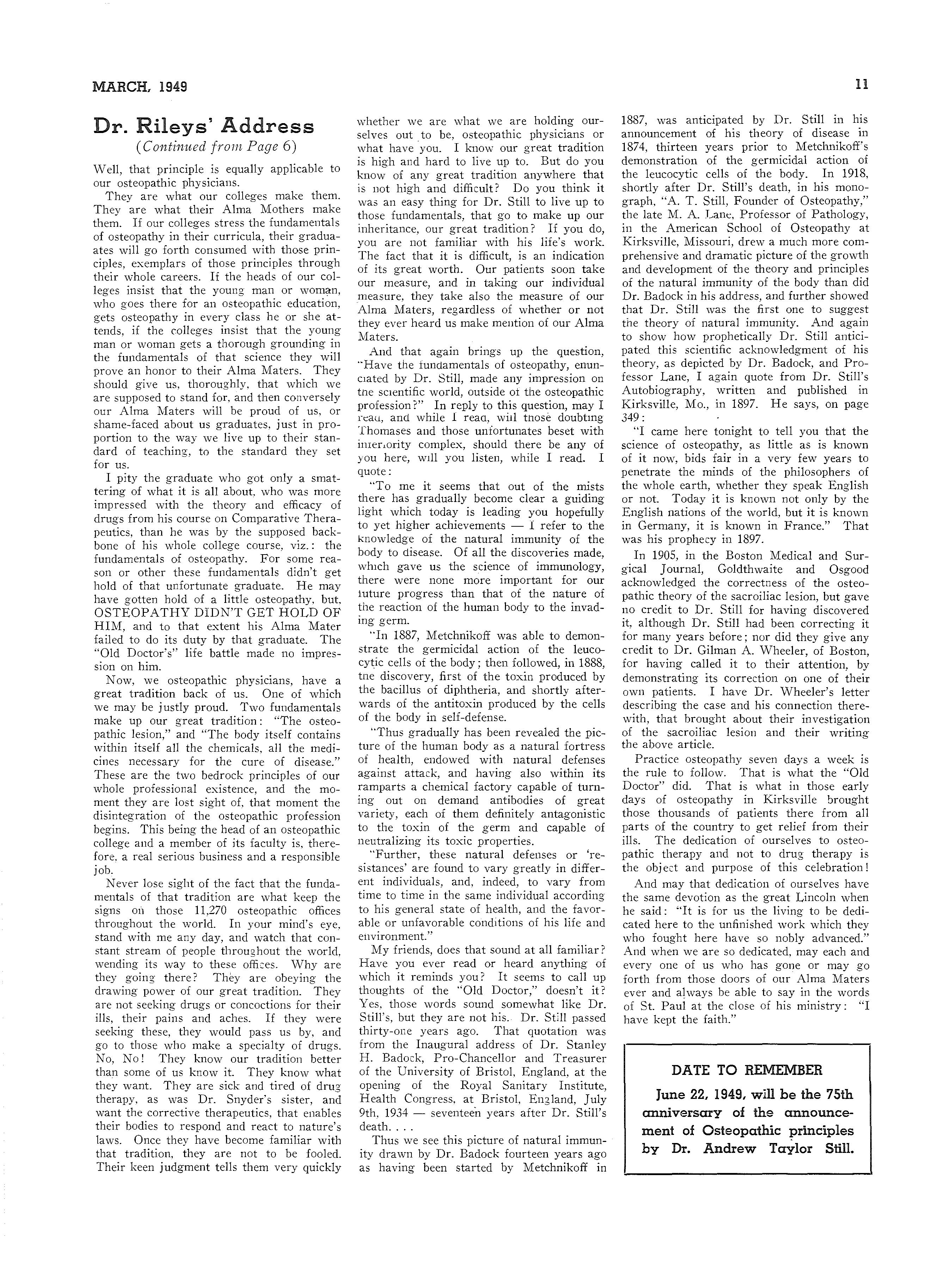 pressed those who had the good fortune to be present. Particularly impressive was the provocative address of the speaker of the day, Dr. George W. Riley, distinguished Osteopathic physician, of New York.
