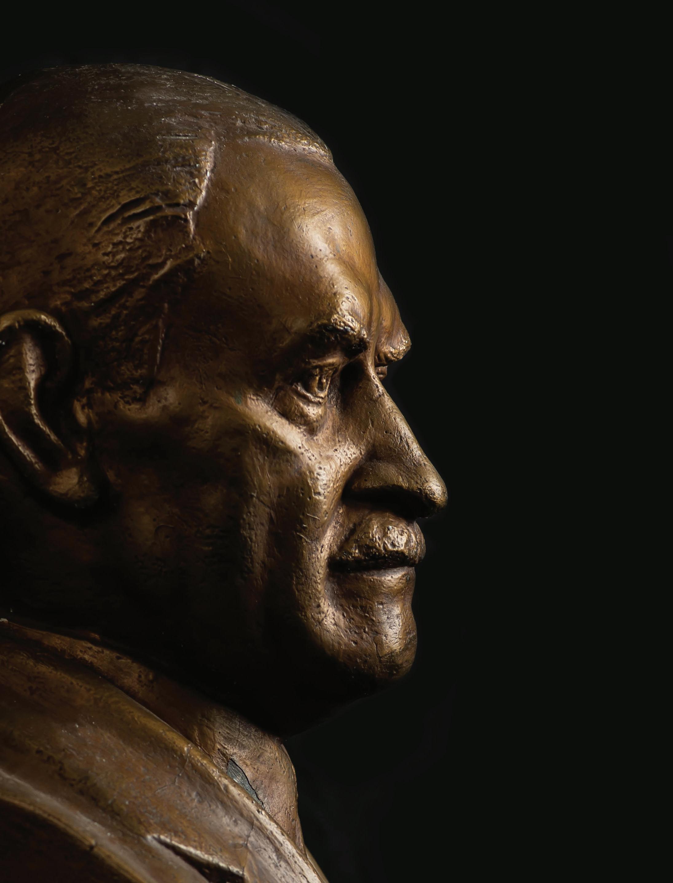 The bust, rediscovered in the College Archives, was photographed for this anniversary issue of Digest Magazine—in tribute to the PCOM presidency. Nothing is known about the sculptor or when the bust was commissioned.