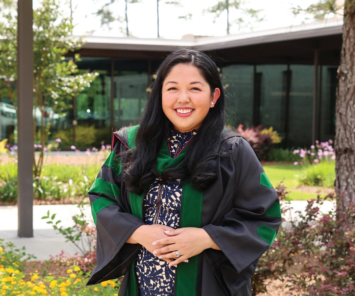Kathleen Bryan, DO ’23, garbed in her Commencement regalia, poses in front of PCOM South Georgia, among the countless longleaf and loblolly pines.