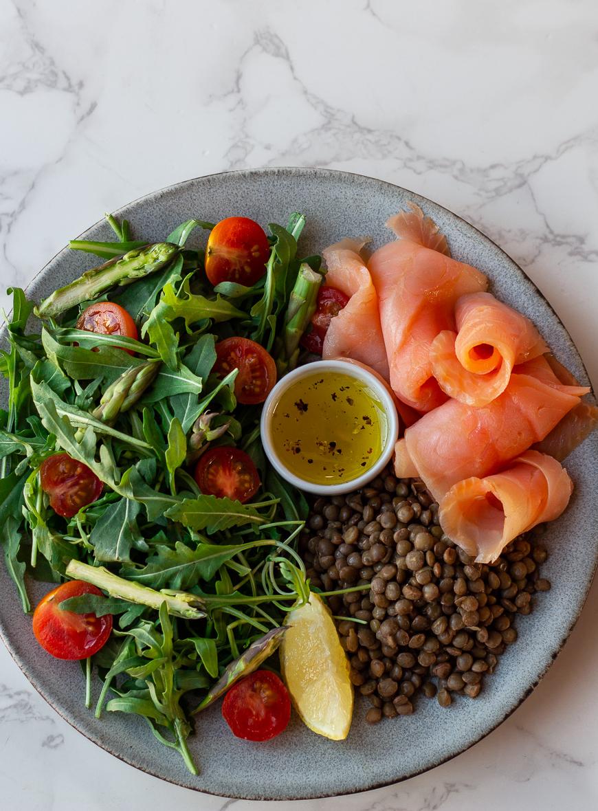Place arugula, tomatoes and lentils in a serving bowl. Toss with lemon vinaigrette. Serve topped with smoked salmon.