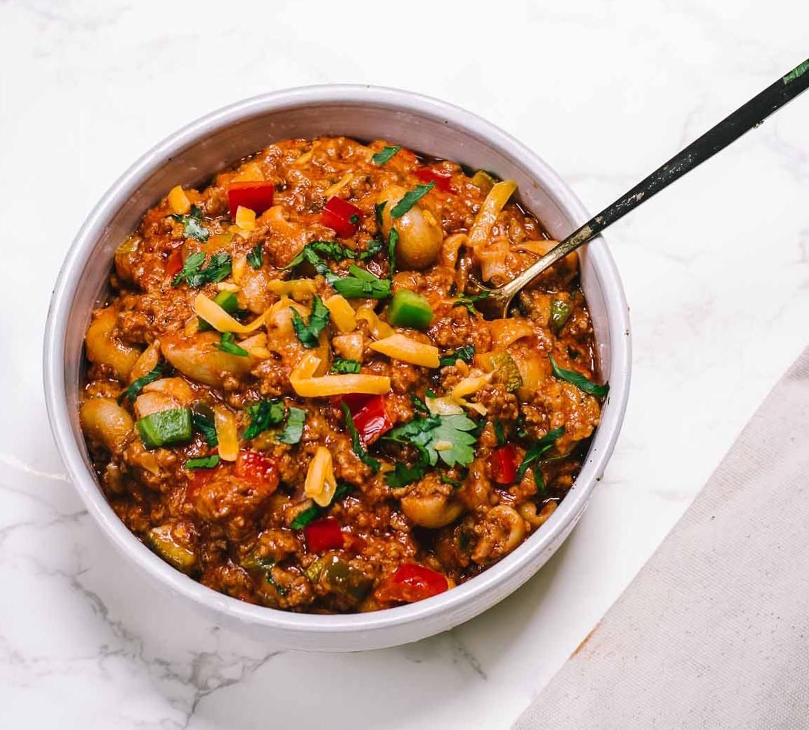 Fill each bowl with roughly 2 cups of chili mac and top with 1 tbsp of dairy free cheese shreds to serve!