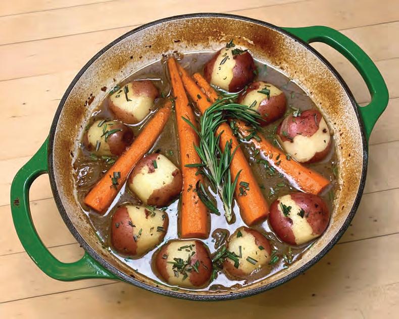 Add onion, sauté 3 minutes until it begins to soften, stir in garlic, and sauté 1 minute more. Deglaze the pan with wine, scraping brown bits from the bottom of the pot. Stir in beef broth and Worcestershire. Return meat and any meat juices to the pot, add rosemary sprig, and place whole carrots on top. Cover and transfer the pot to the oven. Braise 2 ½ to 3 hours until the meat is almost tender. Add potatoes and cook 30 minutes more, or until they are knife tender. Remove the pot from the oven, adjust seasonings if needed, sprinkle with chopped rosemary leaves, and serve.