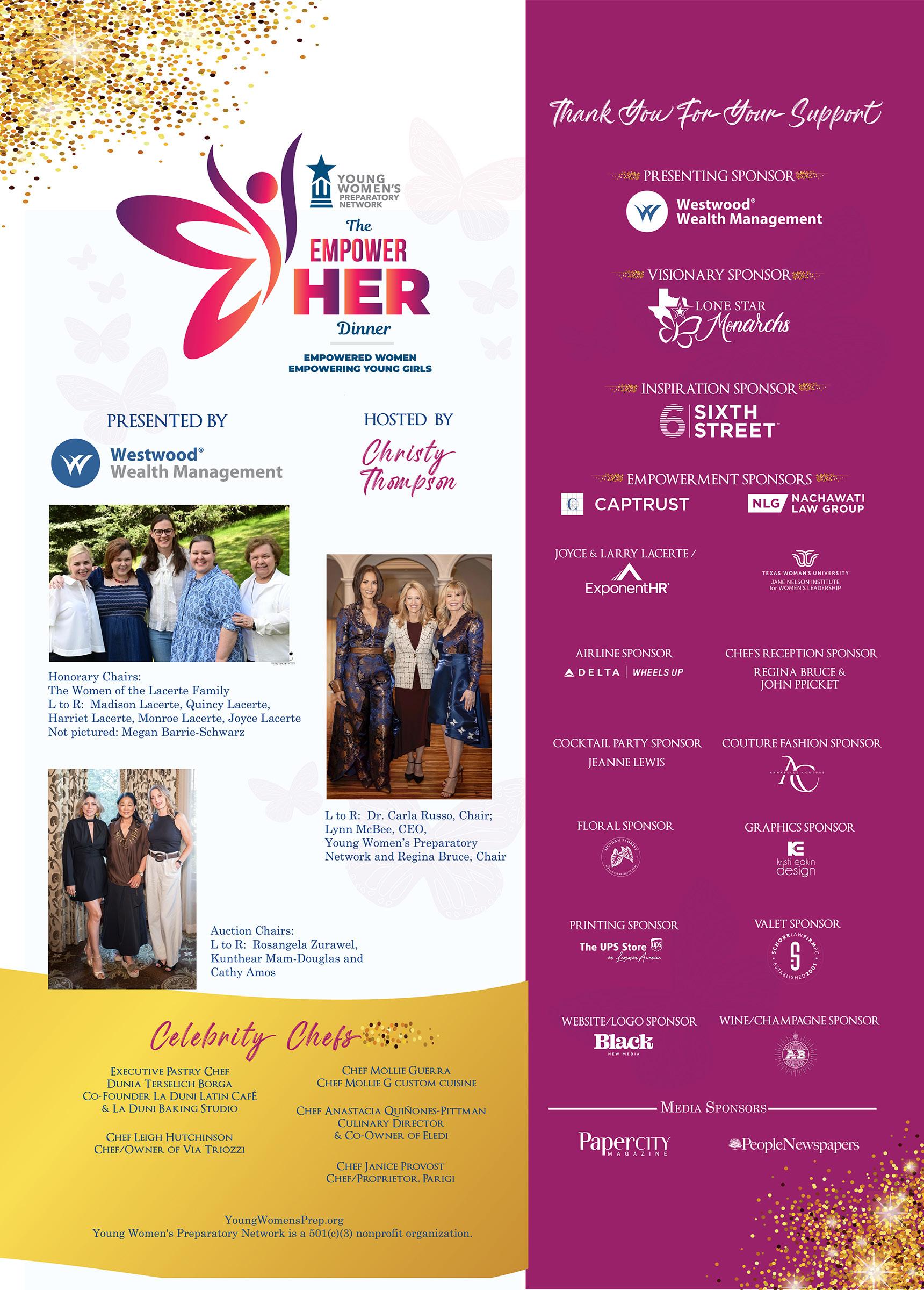 Sponsors: Westwood Wealth Management (presenting sponsor), Lone Star Monarchs (visionary sponsor), Sixth Street (inspiration sponsor), CAPTRUST, Joyce and Larry Lacerte/ExponentHR, Nachawati Law Group, and Texas Woman’s University, Jane Nelson Institute for Women’s Leadership (empowerment sponsors), Regina Bruce and John Pickett (chefs announcement party sponsor), Jeanne Lewis (cocktail party sponsor), Annabelle Couture (couture fashion sponsor), Delta/Wheels Up (airline sponsor), McShan Florist (floral sponsor), Kristi Eakin Design (graphic arts sponsor), UPS Store on Lemmon Avenue (printing sponsor), Black New Media (website/logo design sponsor), A&B Food, Wine and Spirits (wine/champagne sponsor), Schorr Law Firm PC (valet sponsor), and PaperCity and People Newspapers (media sponsors).