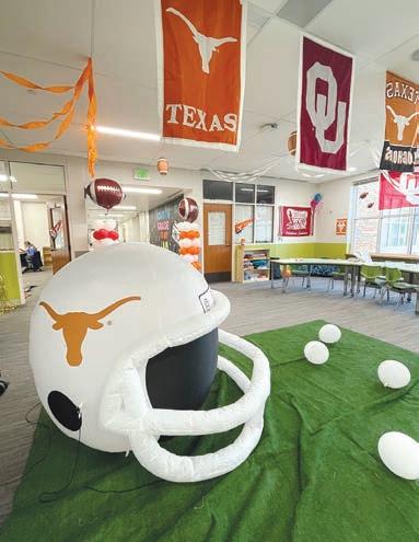For the first station, a Red River Showdown football game-themed field goal challenge, students had to design a makeshift paper football and flick it across a printed “field” with end zones and field lines.