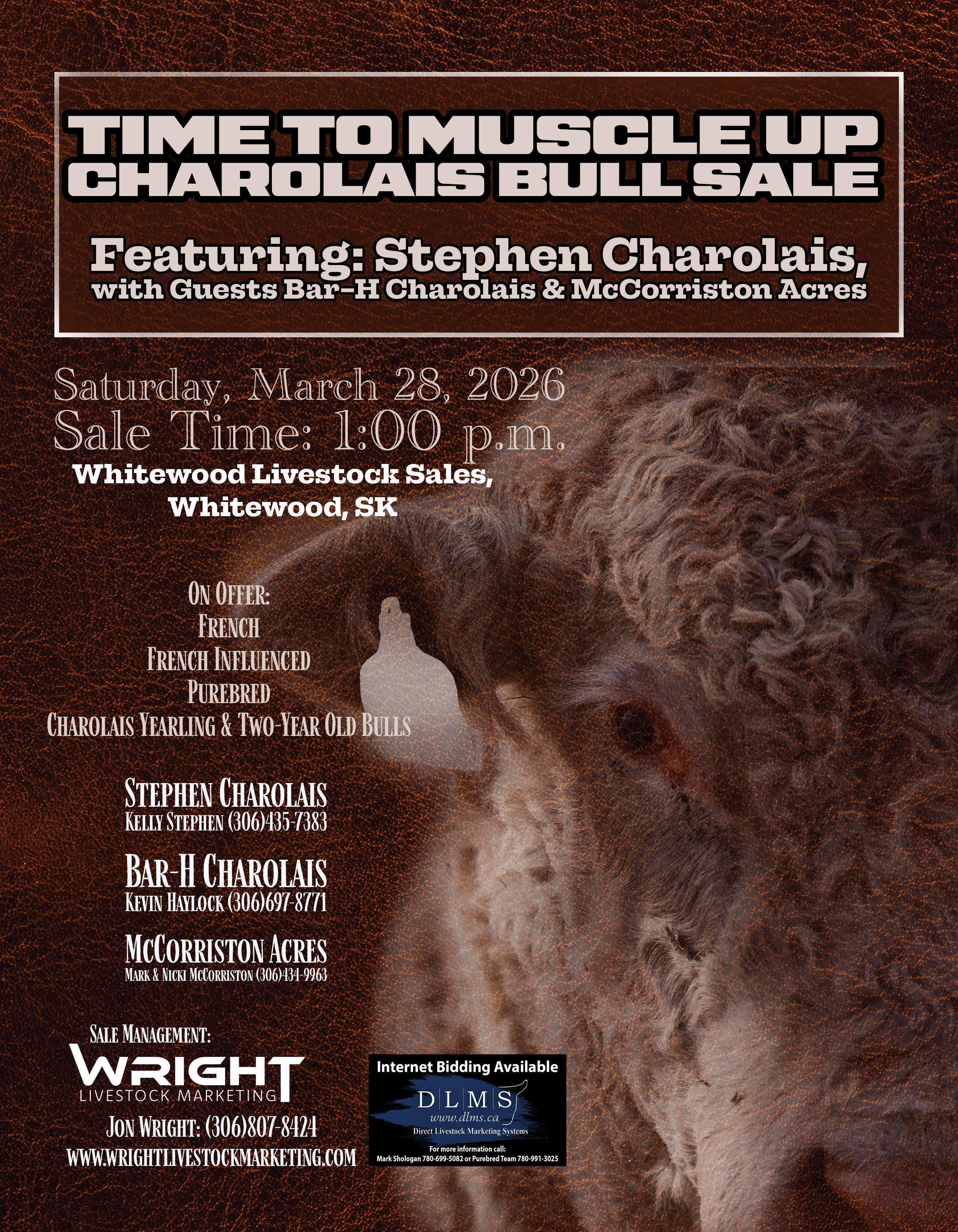 Stephen Charolais, Bar H Charolais & McCorriston Acres Bull Sale, 1 pm, Whitewood (SK) Auction Mart