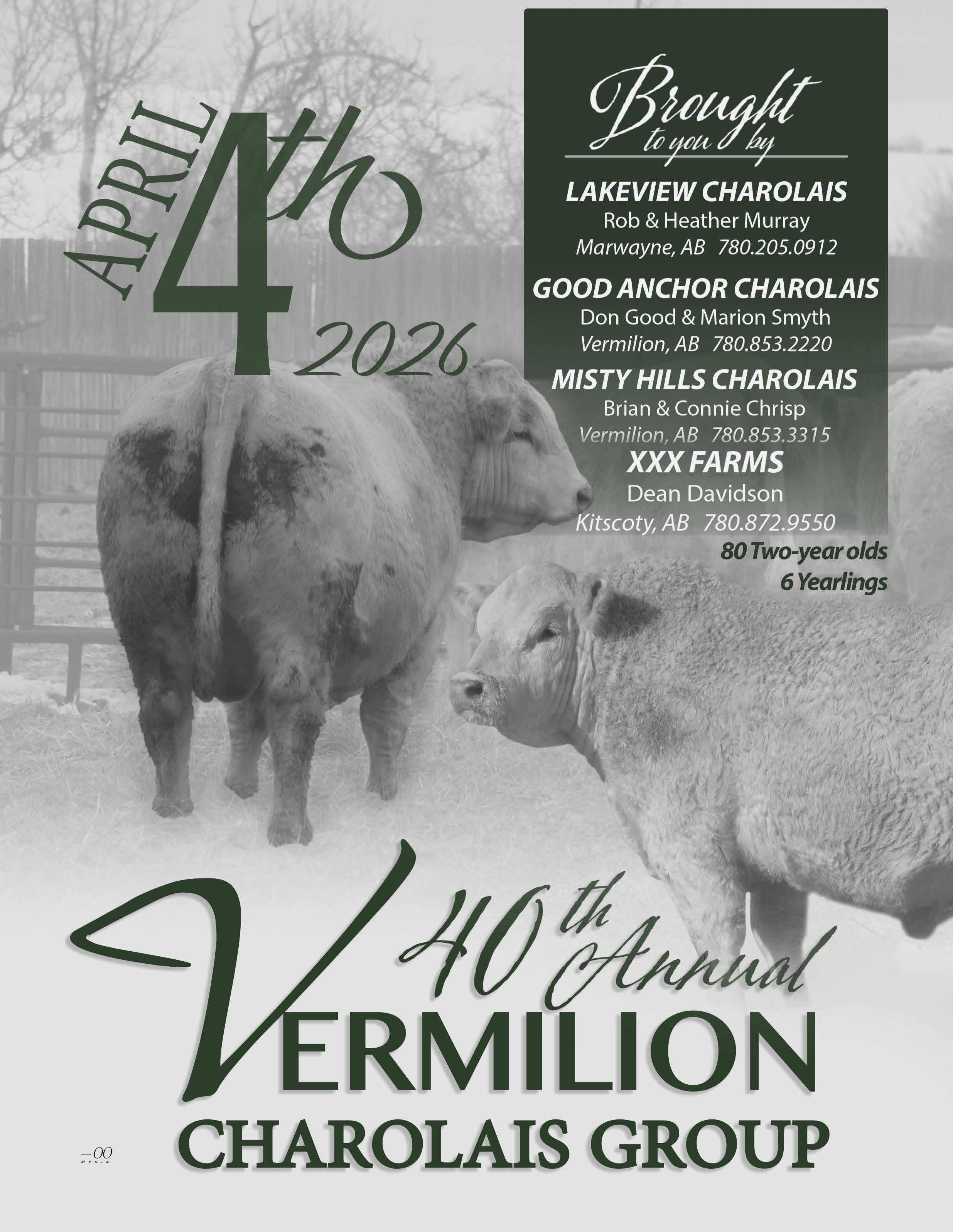 Vermillion Group 40th Annual Bull Sale, 1 pm, Lakeview Charolais, Marwayne, AB