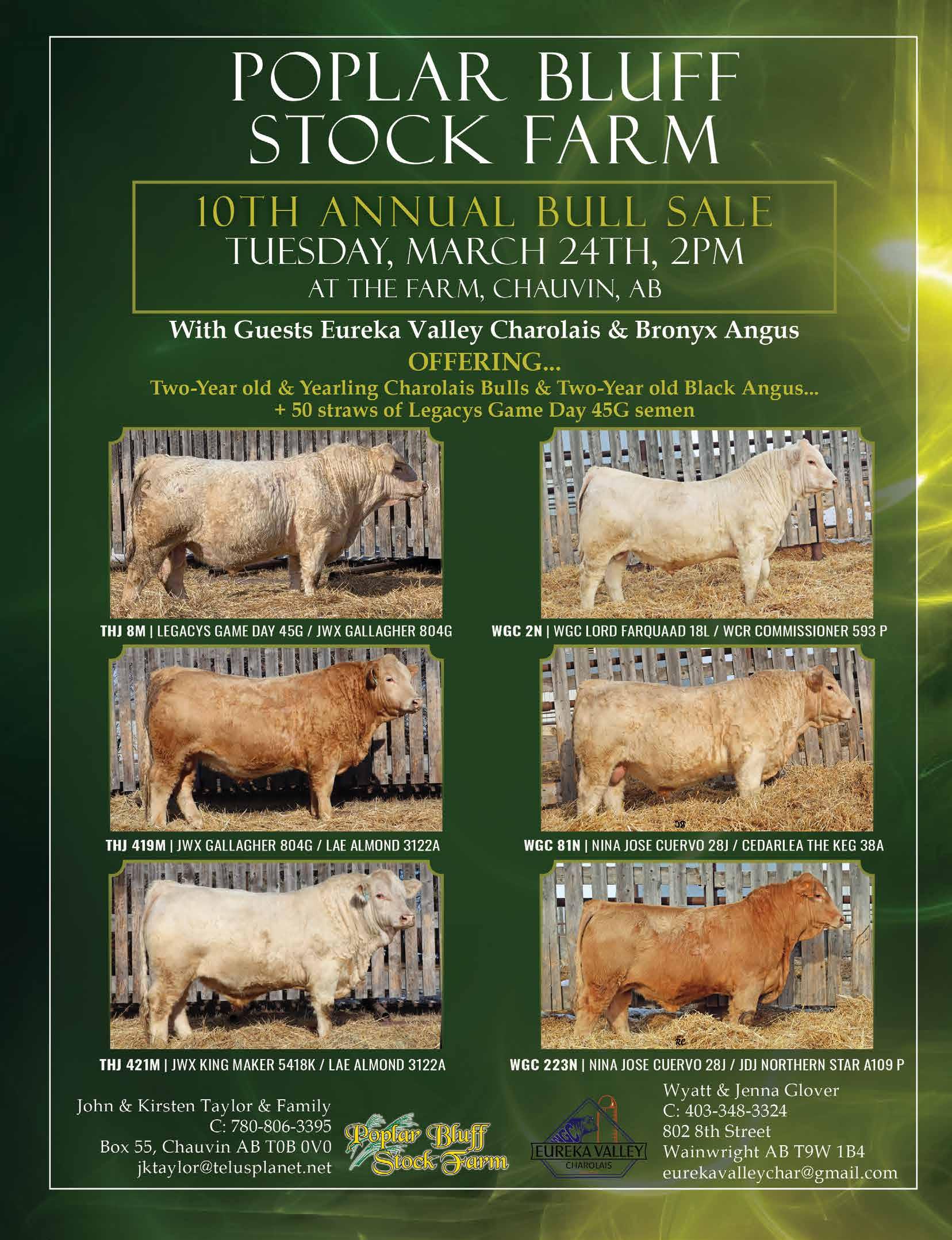 Poplar Bluff Stock Farm with Eureka Valley 10th Annual Bull Sale, 2 pm, at the farm, Chauvin, AB