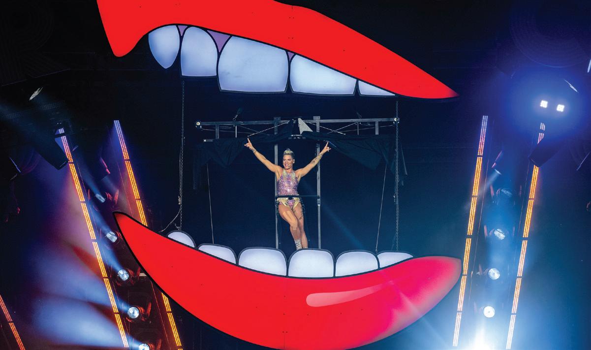 I watched in gasping awe on Aug. 16 as Pink spun through the cool Detroit air, a soaring trapeze artist with a soaring voice to match. Take, for instance, the way she zipped to all corners of Comerica Park during her Summer Carnival Tour, her firstever stadium show in Detroit, while somehow still singing her playfully cocky hit “So What” against the city’s skyline. That acrobatic entrance alone definitely earned her the glass of wine and bubble bath she took shortly afterwards, according to her post-show Instagram post.