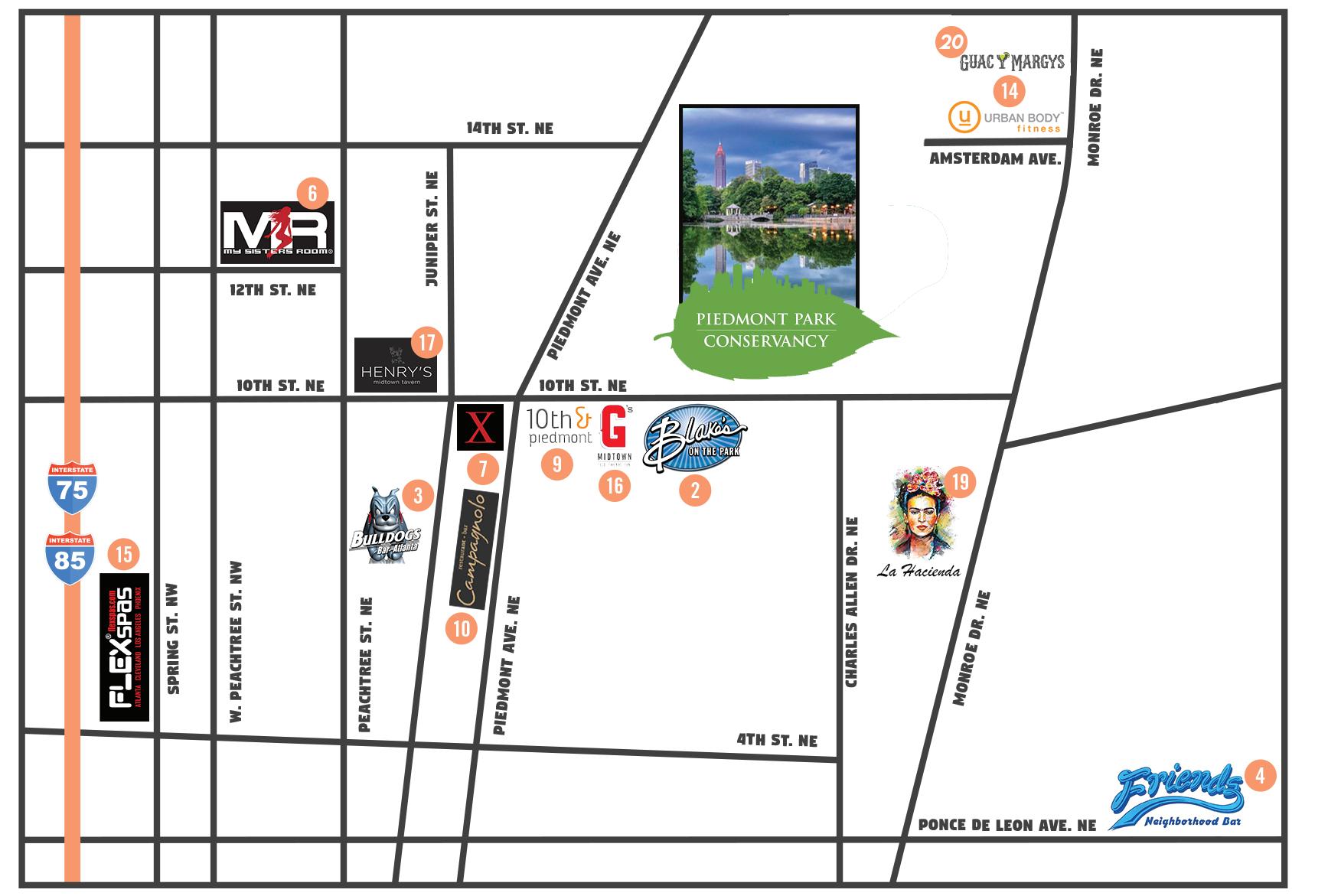 DAVID Magazine pg| 24 2 16 14 13 8 9 7 10 15 17 19 1 3 6 4 P ie dmo n t Av e . N E Ju n ip e r St. N E E N . t S e e r t h c a e P PiedmontAve. NE 14th St NE Ponce De Leon Ave . NE Ponce De Leon Ave . NE 4th St NE Monroe Dr. NE Mon r o e D r . N E 10th St. NE E N . t S r e p i n u J E N . l P n o e L e D e c n o P S p r in g S t . N W Amsterdam Ave . E N . r D n e l l A s e l r a h C W N . t S e e r t h c a e P . W 12th St. NE Pie dmont Park M I DT OWN BARS BARS not on map 2 Blake's 227 10 th S t NE 1 FUTURE ATLANTA 50 Lower Alabama St. SW Suite 180 3 Bulldo g s 893 Peachtree S t NE 4 Fr iend s 736 Ponce De Leon Ave NE 6 My Sister’s Room66 12th S t NE 7 X Midtown 990 Piedmont Ave NE fitness 14 Urban Body Fitness 500 Amsterdam Ave NE spa /bath 15 F lex S p a 76 4th S t N W Dining 9 10th& P iedmon t 991 Piedmont Ave NE 10 Camp ag nolo 980 Piedmont Ave NE 16 G’s M id t o w n 219 10 th S t NE 17 Henr y ’s 132 10 th S t NE 19 L a H acienda 900 Monroe Dr NE