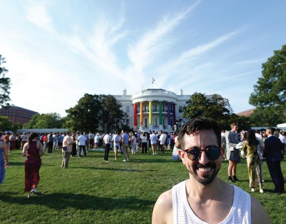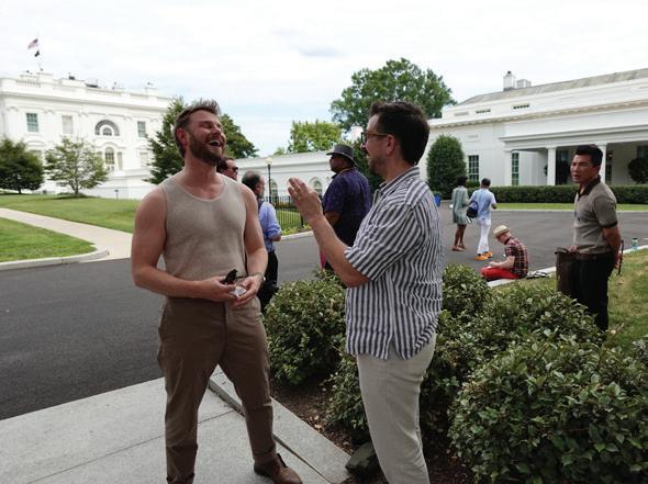My own out-of-body excitement took me to new uplifting heights as I bounced around the lawn wondering, randomly, what my 8th grade government teacher might think of me being here. I couldn’t snap photos of White House Pridegoers fast enough: samesex parents playing yard games with their children, lines of people at the many refreshments tables enjoying hot dogs (all beef) and chips, and others trying to preserve their energy in the 98-degree heat, sprawled out on