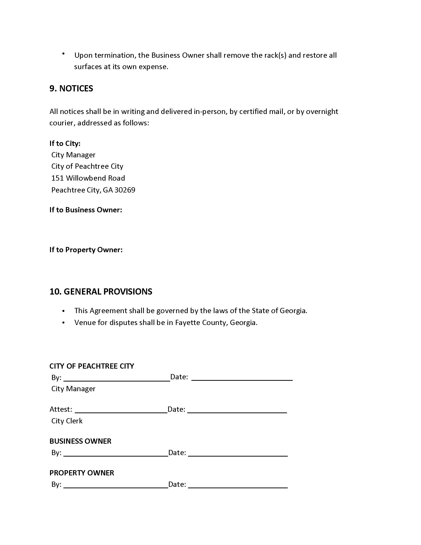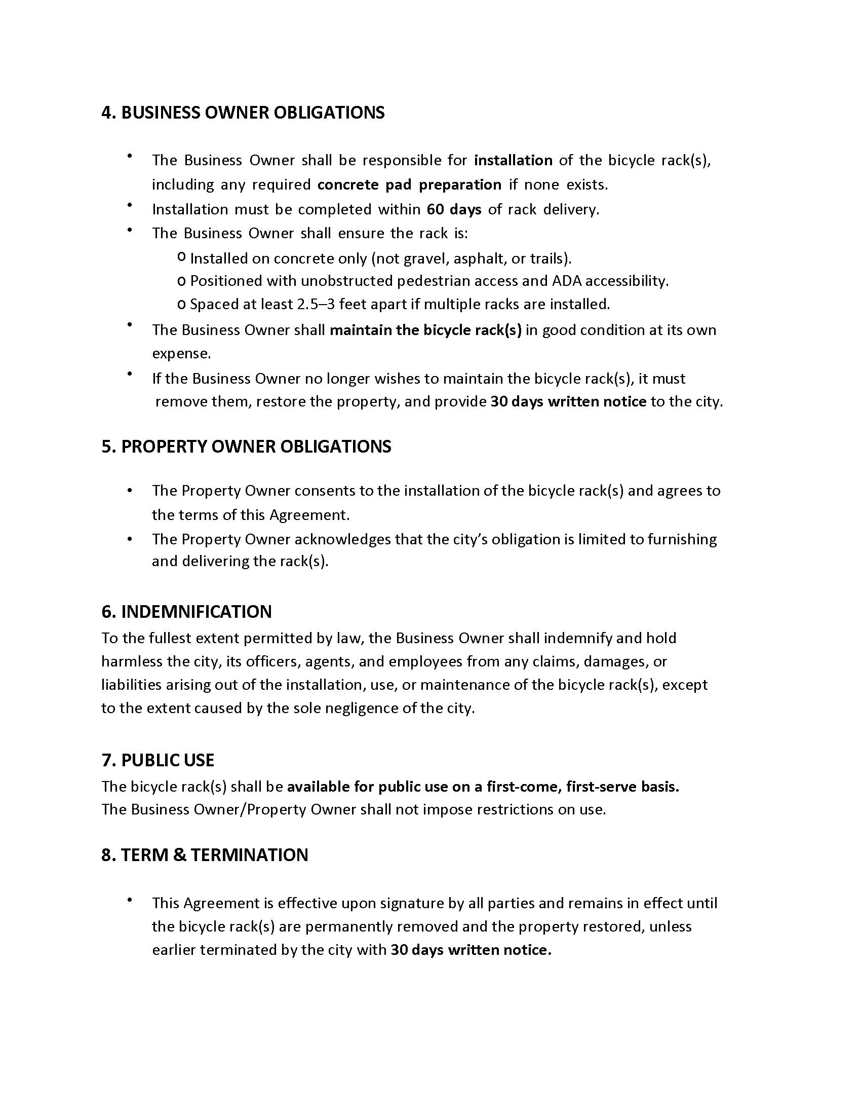 Please note: Installations on private property will require a signed Agreement between the property owner and the city. The city will deliver the bike rack, and the business will be responsible for installation