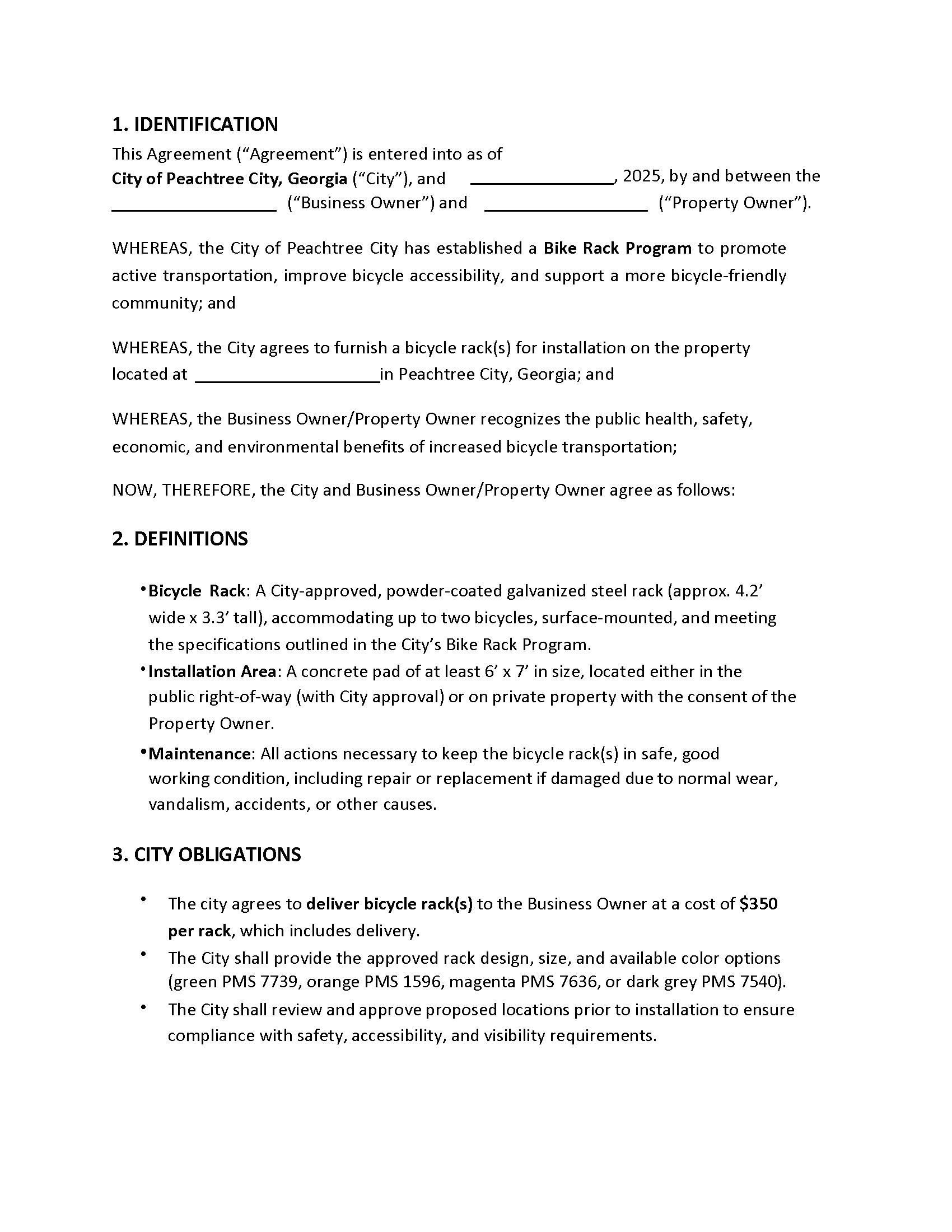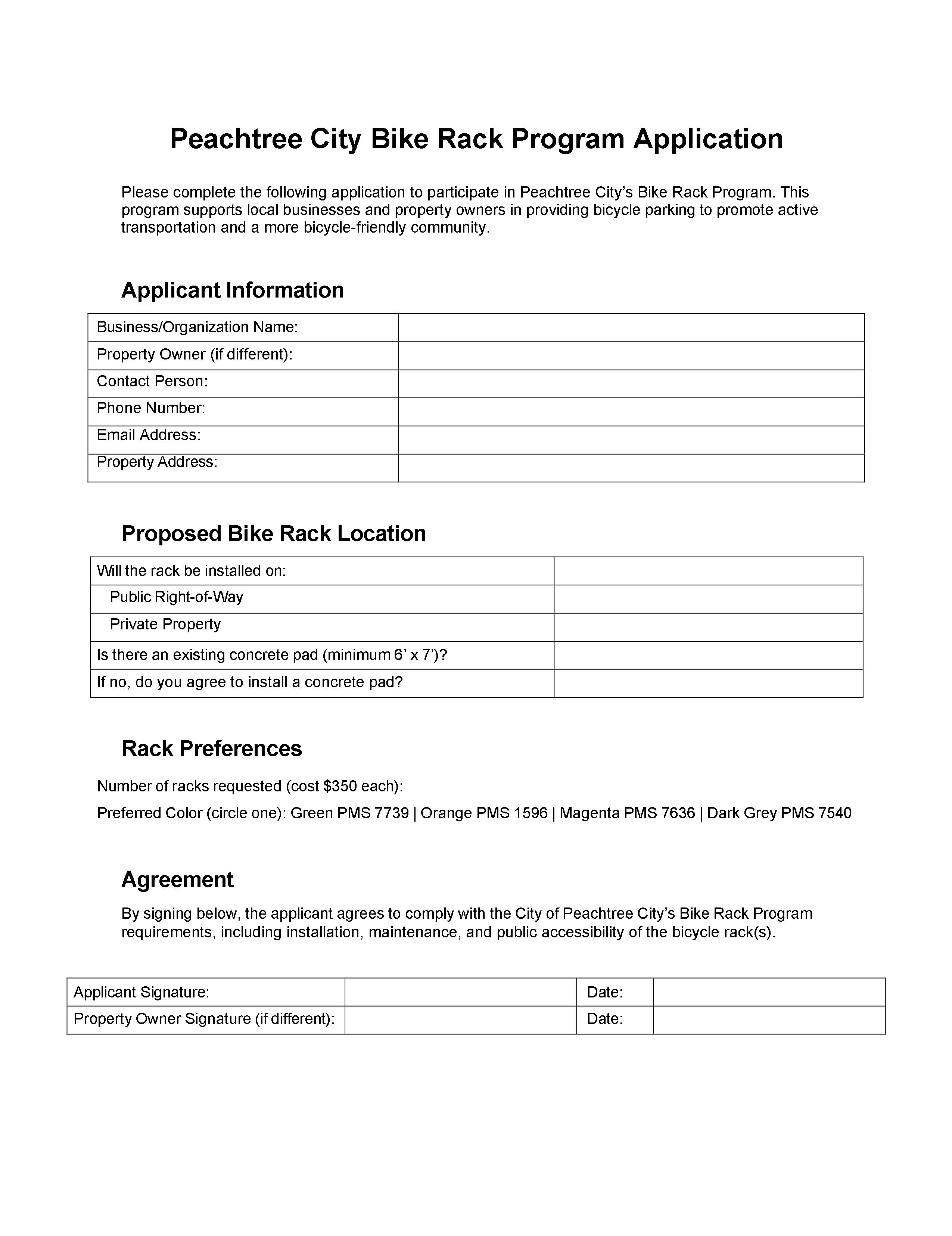 The City of Peachtree City's Bike Rack Program is part of a broader initiative to promote active transportation and support a more bicycle-friendly community With over 15 new bike racks to be installed throughout the city, the program enhances accessibility for cyclists, making it easier to commute, run errands, and explore We want to extend this program to local businesses Investing in bicycle infrastructure helps the community by boosting the local economy, improving safety, and encouraging healthier lifestyles Well-placed bike racks and trails attract tourism and provide greater access to businesses, further strengthening Peachtree City's commitment to sustainable and active transportation