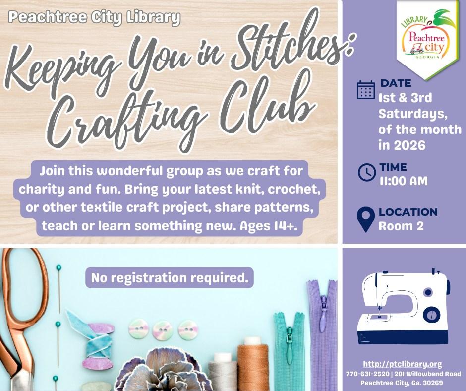 Join this wonderful group as we craft for charity and pleasure. Bring your latest knit, crochet, or other textile projects, share patterns, teach or learn something new. Grab a calendar of events. This is a free, drop-in event. Ages 18+. No registration required.