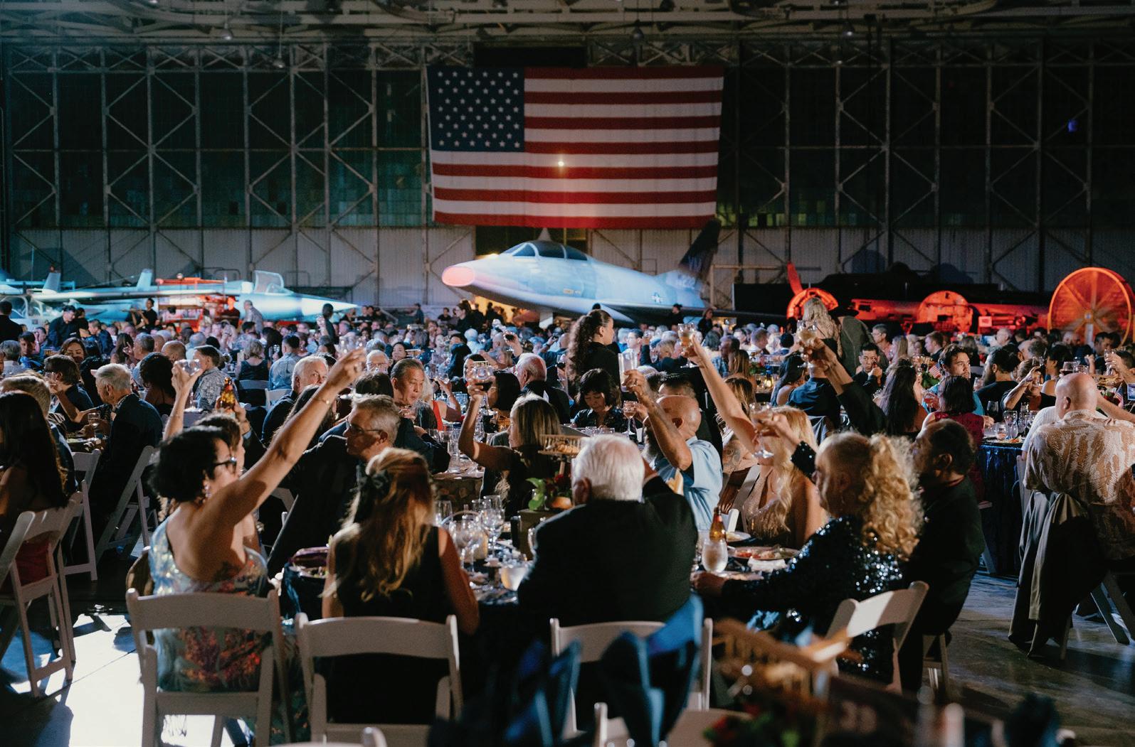 Guest raise their glasses for a toast in historic Hangar 79 as they celebrate during Pearl Harbor Aviation Museum's 2025 For Love of Country Gala.