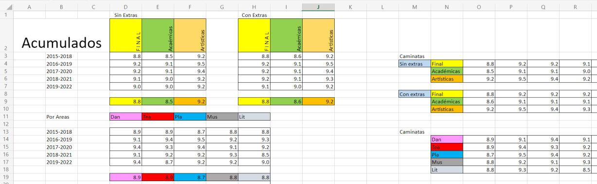 Una vez recopilados los datos de cada una de las cinco generaciones se gestionó un archivo que compilaba la información de cada una de estas para llevar a cabo el acumulado total de calificaciones que representan el rendimiento escolar de las generaciones.