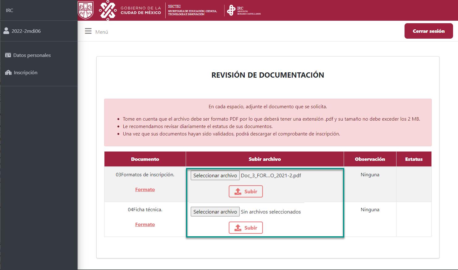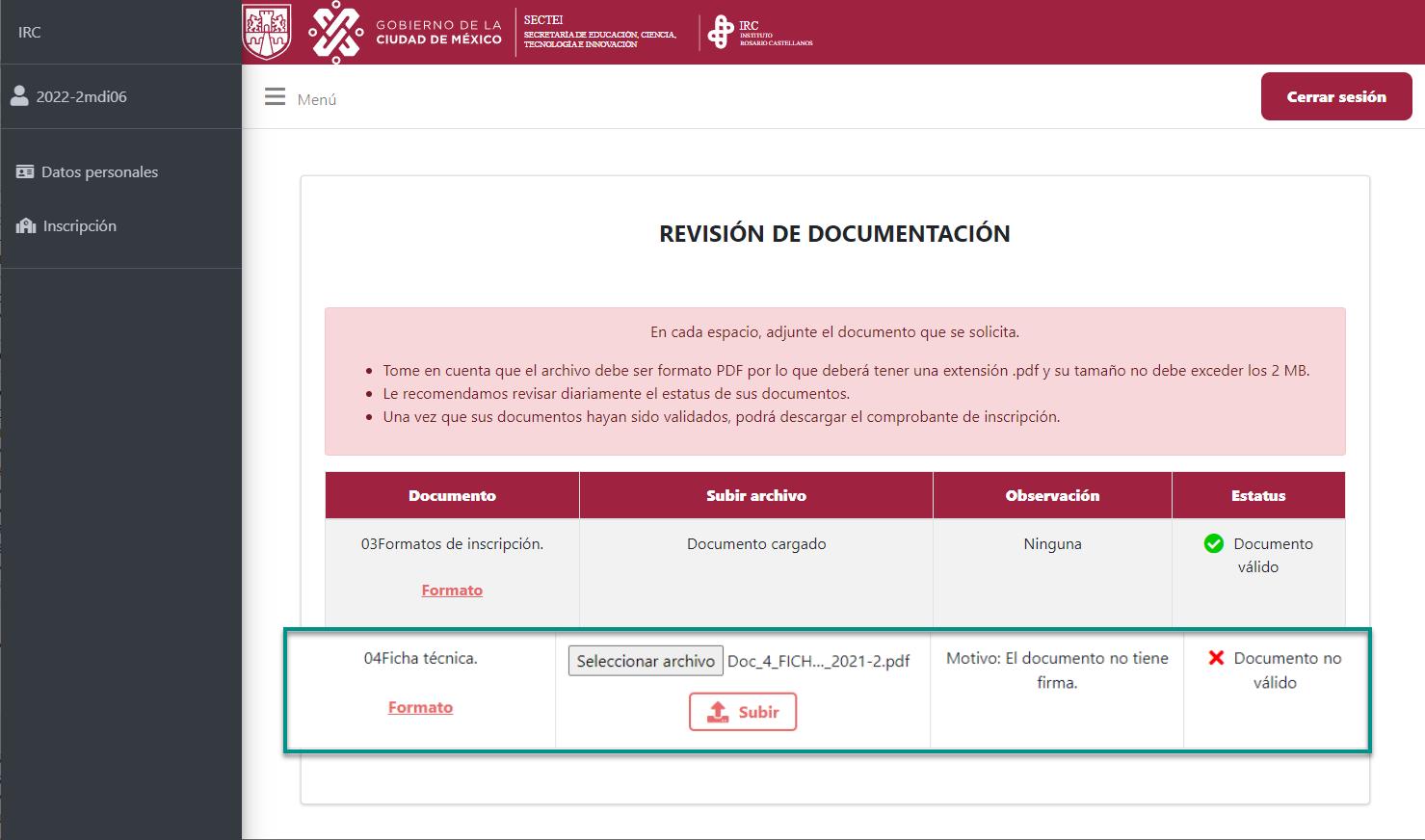 - En casodequeunodesusdocumentostengaunestatusnoválido,deberárealizarlascorrecciones necesariasyvolveracargarlo.