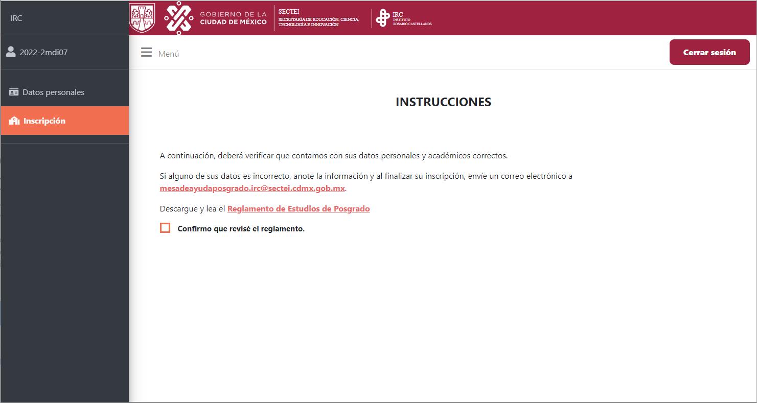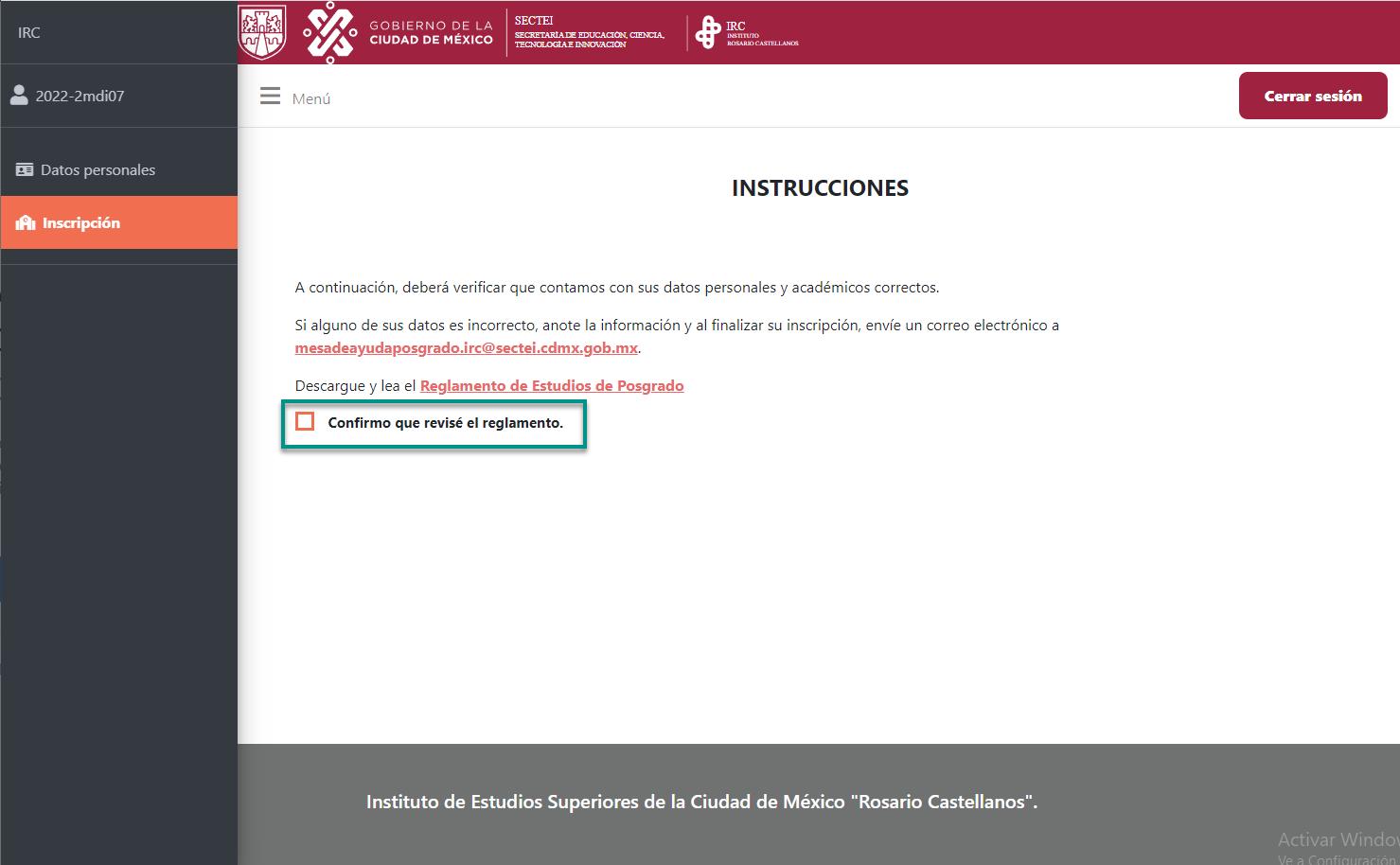 8. SemostraránlasinstruccionesyladescargadelReglamentodeestudiodeposgrado. Alconcluirlarevisióndeéste,déclicsobrelacasilladeverificación.