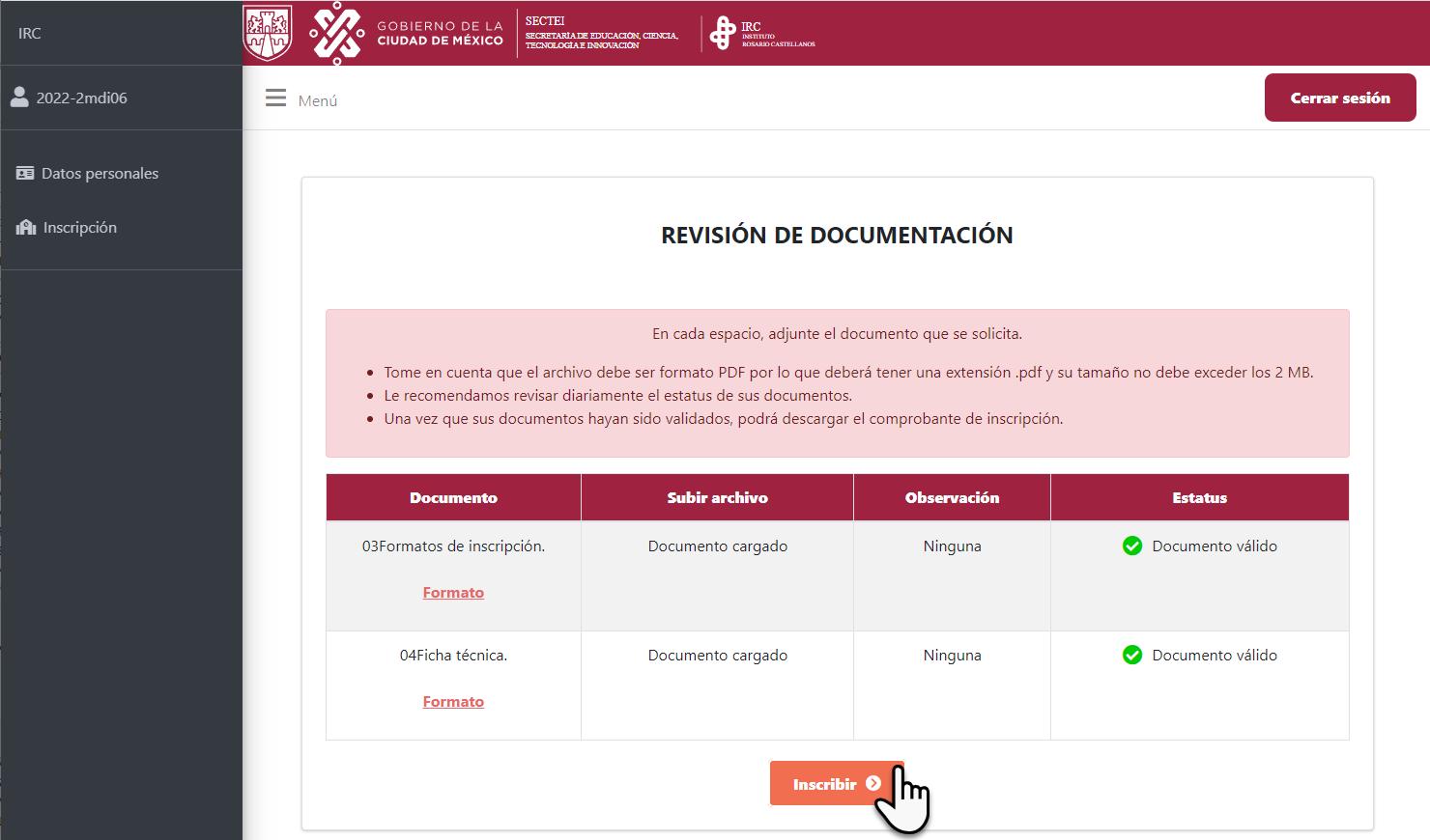 - Durante el periodo de inscripciones, debe ingresar diariamente al Módulo de inscripción para verificarquesusdocumentoshayansidovalidados.