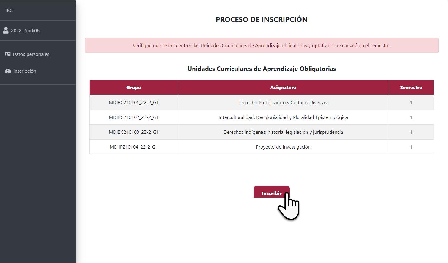 19.Se mostrarán las UCAS que cursará en el primer semestre. Luego, presione el botón Inscribir.