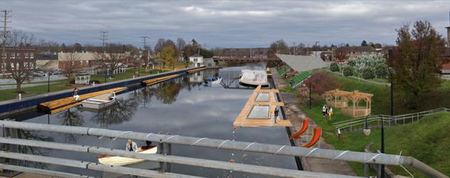 The final design proposal for the Newark Canal Downtown reimagines the canal as a public, people-centered destination, expanding its use beyond boat access to serve the broader community. The project introduces a series of docks along both sides of the canal, supporting boating activity while also creating continuous pedestrian circulation along the water’s edge The southern portion of the site features floating docks designed for public use, including lounge areas with mesh hammock structures suspended over the water, offering spaces for rest and interaction with the canal. A designated children’s swimming area, complete with slides, is introduced adjacent to the existing park, enhancing recreational opportunities for families while maintaining safety. Significant upgrades were also made to the parking area and surrounding parkland, transforming the site into an elevated canal park with overlooks and integrated seating. New trails and walkways were added throughout the park to improve circulation and provide a cohesive experience, allowing visitors to fully engage with the canal and its surrounding landscape.