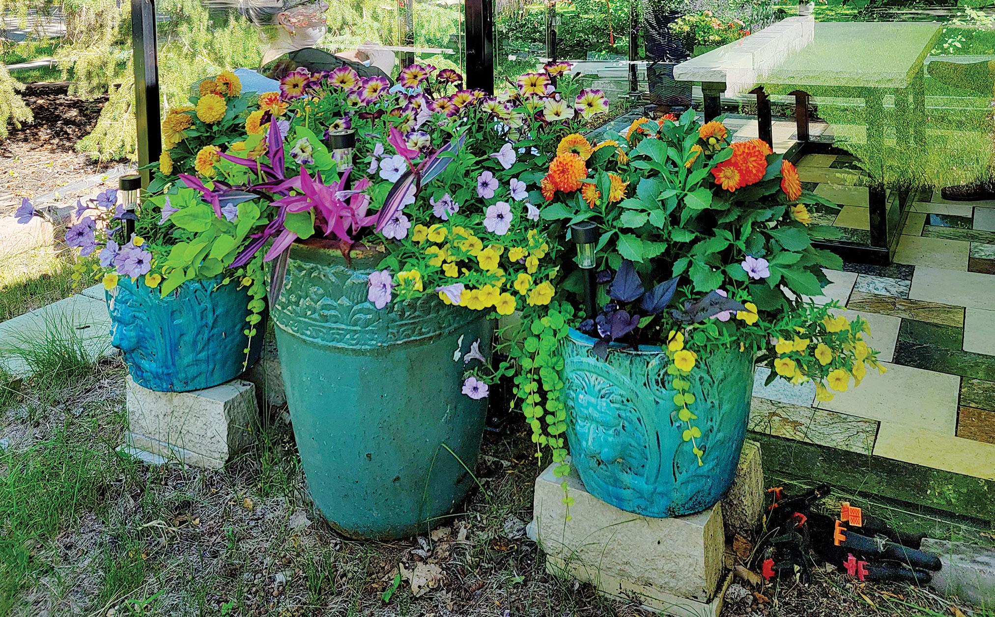 Not satisfied with the spaces offered by seven garden areas, I decided to point my green thumb in the direction of pot-scaping. Numbering at one time 85 pots of flowers, these have been reduced to 50, although I compensated for this by installing 21 hanging baskets. To enjoy the garden view after sundown, I added 60 solar-powered lights along the garden pathways, in pots, and in the ceiling of the gazebo, which cast an inviting glow through out the yard. We decided recently to secure the backyard gardens from visit ing cottontails and white-tailed deer by installing wire and steel fences and gates. While these herbivores can still nibble on sweet potato and flowering plants in the two raised gardens in the front yard, plants in the backyard are finally safe. As all gardeners know, there is always another project around the corner, and new varieties of plants to introduce into the garden landscape, helping to create a symphony of flow ers. p