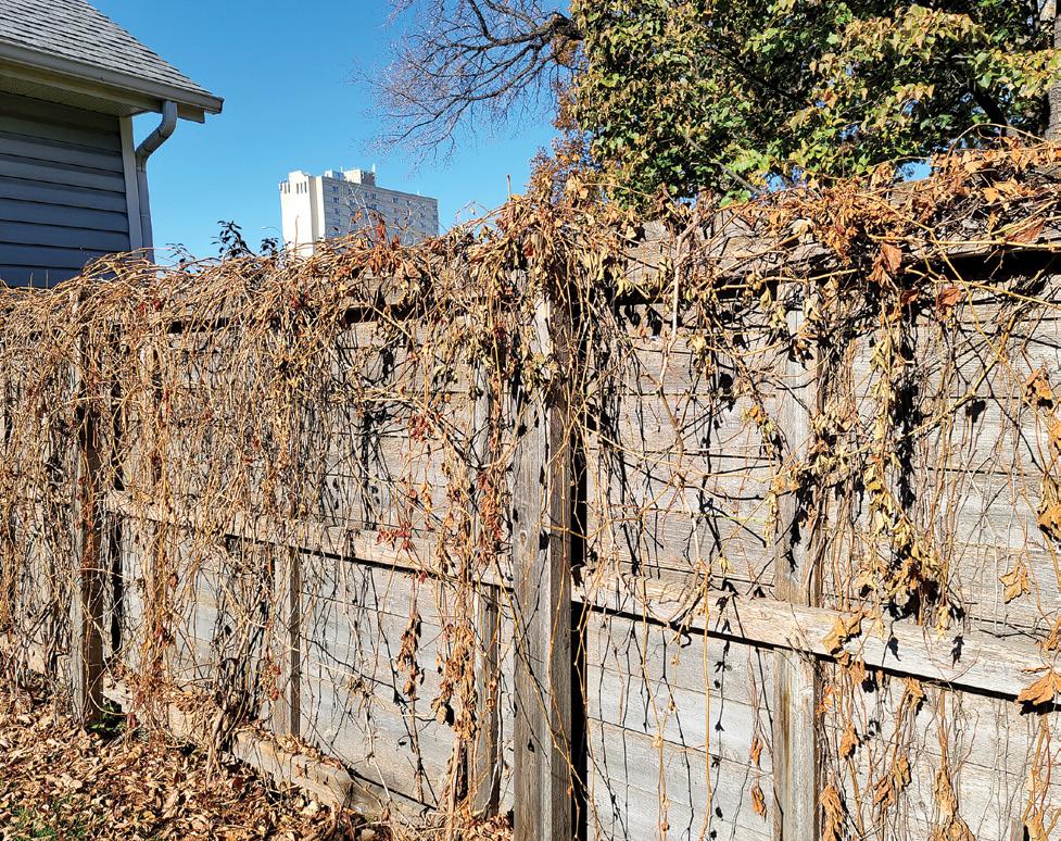 The fence between the front and back hosts Englemann's ivy. I’m thinking of planting grapes here. It will take a few years for them to amount to anything, and the birds