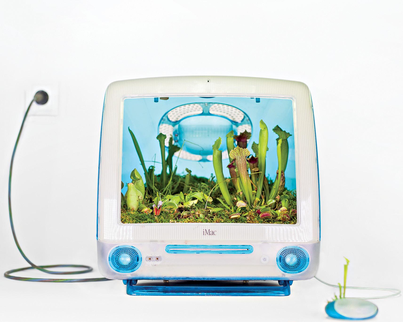Inside the hollowed-out screen of a late 1990s Apple Macintosh computer, the artist Christophe Guinet (born 1977) has created a terrarium garden featuring Venus fly traps and sarracenia that raise their trumpet pitchers to a clear blue sky formed of the computer’s translucent plastic shell.