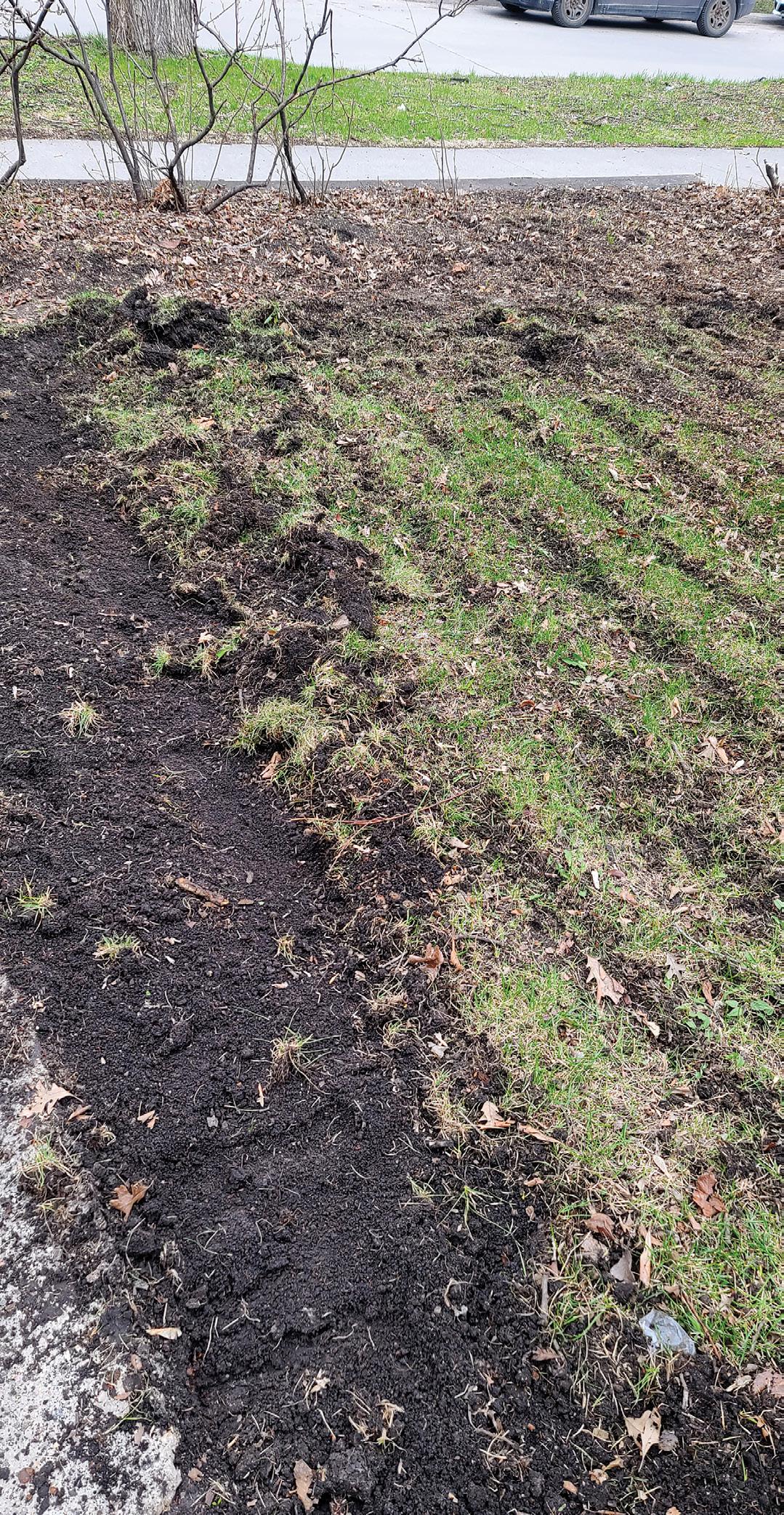 This year, I’m doing an ornamental plot of about 18 feet by 13 feet. My house faces north and it’s on one side of the lot. I found it incredibly difficult to lay down newsprint and keep it there while I watered it in windy Winnipeg so this year I decided to lift the sod. I thought that would be easier.