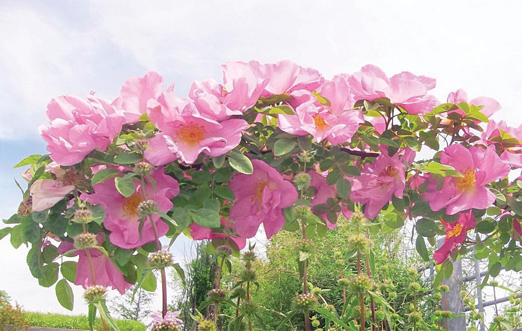Wander Westview Terrace, a sheltered area with aromatic plants (viburnum, daphne, lavender), delicate faerie roses, a waterfall and water channel to soften the cool hardscaping of the paved courtyard. Sculpture, long a tradition in formal French and Italian Renaissance gardens, is becoming popular in North America. In 2018, Toronto Botanical Garden hosted Zimsculpt, a small business, displaying over 100 pieces of hand carved stone from Zimbabwe. A sleek heron stands tall in the Westview Terrace. The Garden Web, a stunning nine meter high stainless steel modern sculpture by Ontario College of Art graduate Ron Baird, gleams against the brilliant blue, a piece of whimsy and imagination.