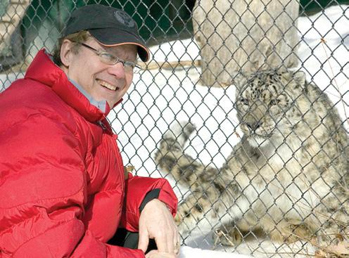quence with another markhor, the leopard was successful, and with super-feline strength dragged its heavy prey back up the slope for a kilometer to reach its den, where its cub was waiting for food. How the photographer managed to capture such action of one of the world’s mostsecretive big cats was amazing. Since Dmitri’s enclosure was close to my office, I could not resist visiting him almost daily, and soon we developed a special bond. This was likely stimulated by a spray of his favourite perfume –men’s Bvlgari. On each occasion, Dmitri curled up his nose and lips, began to salivate profusely, and then repeatedly rubbed his cheek and shoulder with force against the fence wire right beside me, while uttering little enduring ‘puff-puff’ calls, and then finally rolling over onto his back, as if he wanted me to scratch his tummy. I used the long antenna of my radio to tickle him (through the fence wire), and it was obvious he did not want me to stop. When I backed away to leave, he leapt instantly to his feet, and placing his front paws high onto the chain-link fence, he executed the powerful stretching movements of sharpening his impressive claws. In fact, he applied such pressure that sometimes pieces of his claws snapped off and flew through the air, something I obviously did not want to encourage. The fragrance turned him into a big kitten, every time!