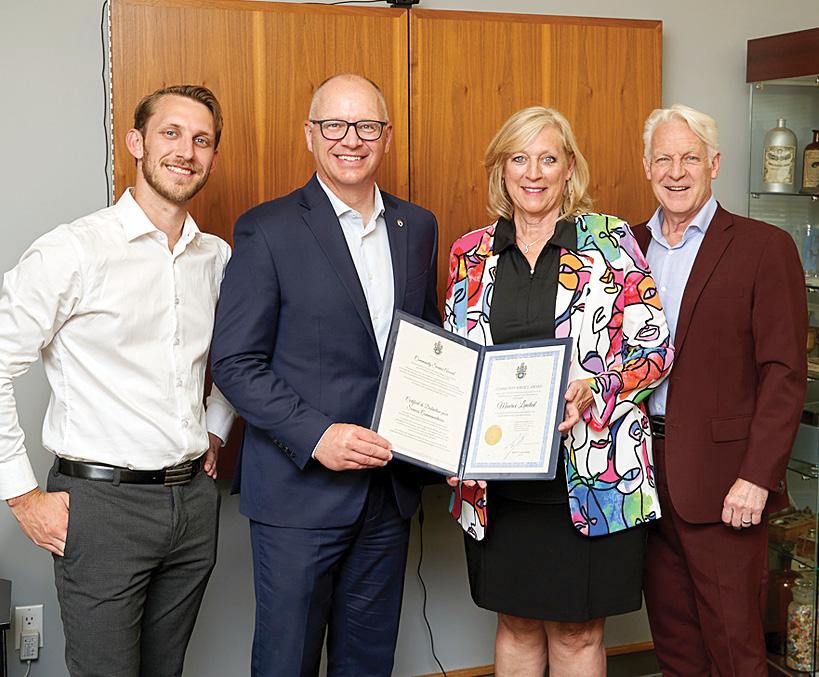Mayor Scott Gillingham helps commemorate Manrex's 50th anniversary with the three shareholders of the company.