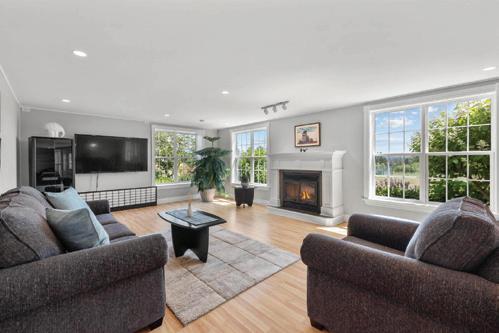 Year-round comfort is guaranteed with a newly installed geothermal heating and cooling system (1 year old), in-floor concrete over-pour heating, a wood-burning stove, propane fireplace, and a preheated solar boiler. A standby propane generator ensures peace of mind during Island storms. Outdoor living is equally impressive, featuring a spacious glass-railed balcony, covered stone patio, and a fully fenced backyard surrounded by manicured grounds with berry bushes, fruit trees, and room for future expansion. Additional features include a two-car attached garage, a two-car detached garage, a paved driveway, and a gravel entrance for ample parking and storage.